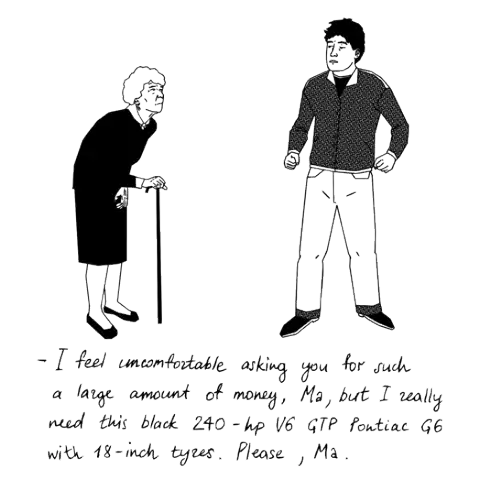 («Мне неловко просить у тебя такую крупную сумму денег, мама, но мне правда очень нужен этот черный, 240-сильный „понтиак-купе“ V6 GTP с 18-дюймовыми колесами. Пожалуйста, мам».)