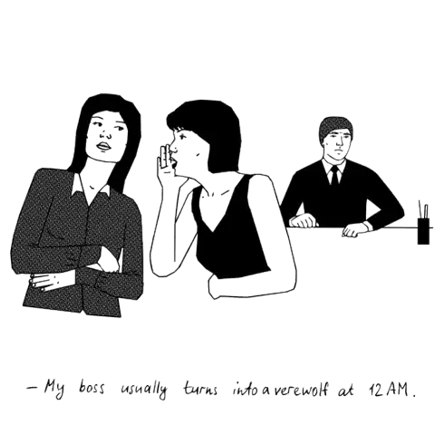 («Обычно мой начальник превращается в оборотня в 12 часов ночи».)