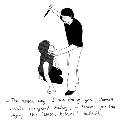 («Я убиваю тебя, чертов русский эмигрант Андрей, потому что меня задолбало слушать, как ты повторяешь reason because.)