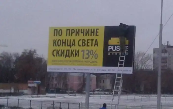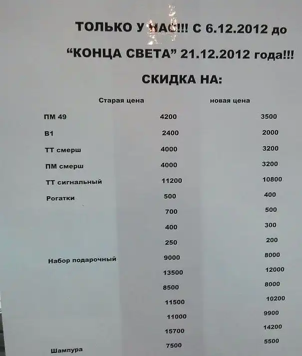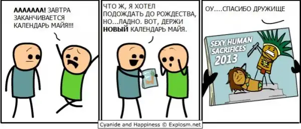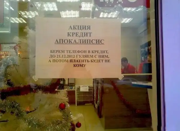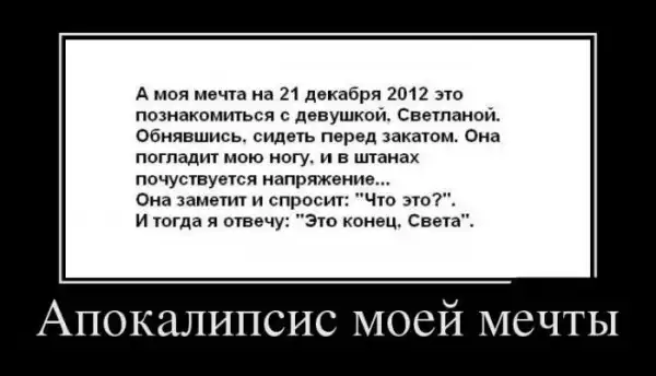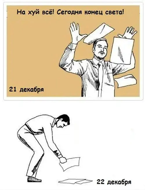Большая порция приколов по поводу конца света. Даже если Вы и верите в приход апокалипсиса, я не советую Вам делать необдуманные глупости, о которых потом обязательно придется пожалеть ;)