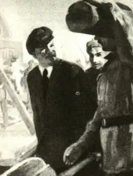 Ленин направляет на верный путь рабочего, который тащит бревно.