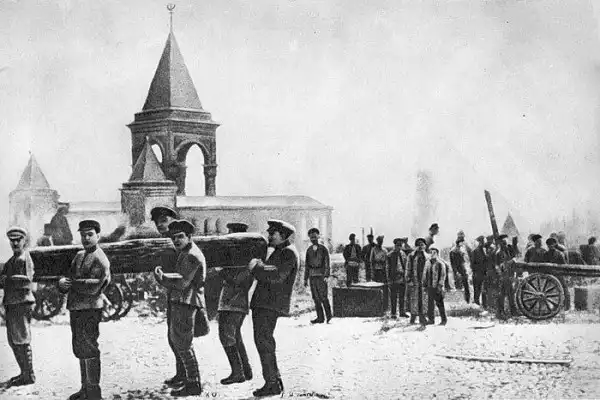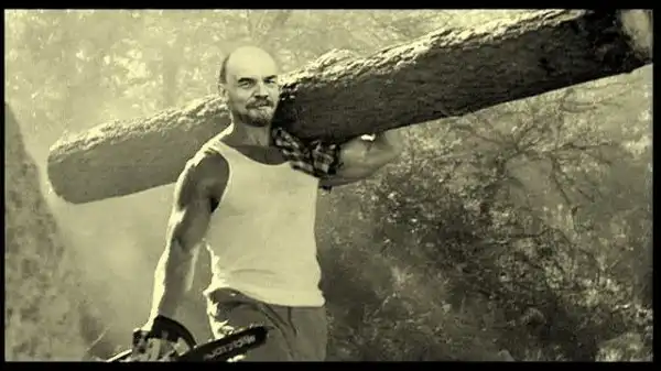 Реальная фотография Ленина на субботнике. Мы видим, как вождь силится поднять бревно, которое без особого труда держат рабочие.