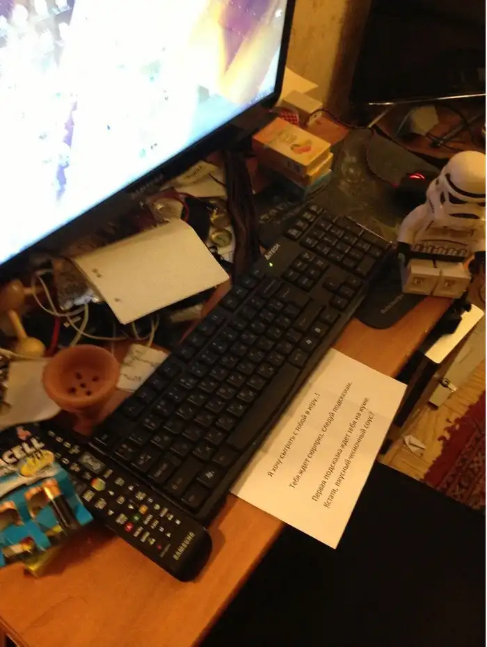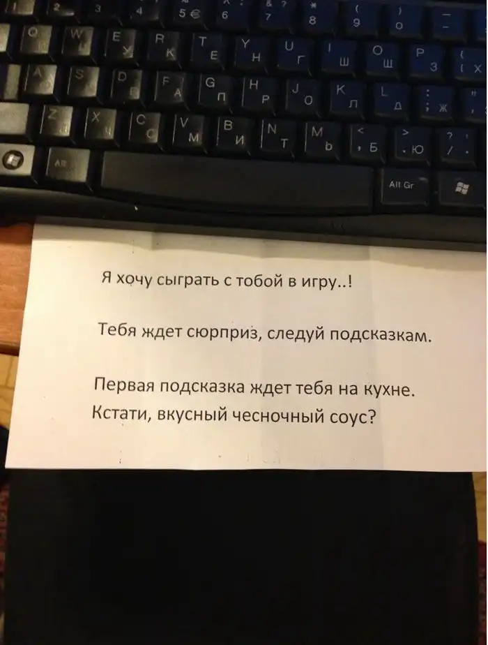 В последнее время стало популярным делать сюрпризы для именинников. Записочки всякие писать, квартирные квесты организовывать. Одна девушка решила устроить своему парню небольшое приключение, для чего скооперировалась с его братом. Как только наступила полночь, под клавиатурой у виновника торжества появилась занятная запсисочка.