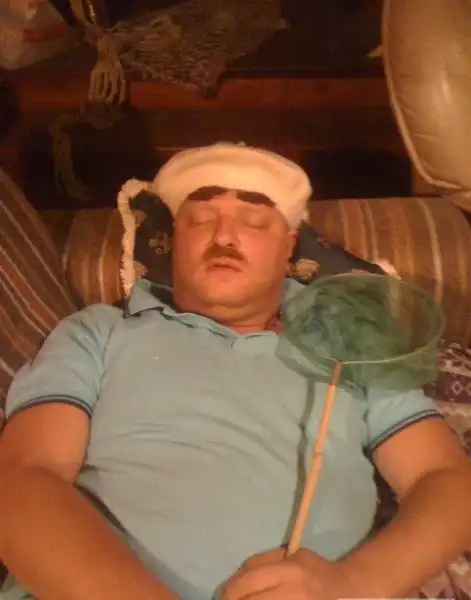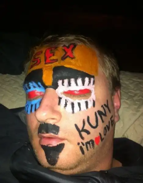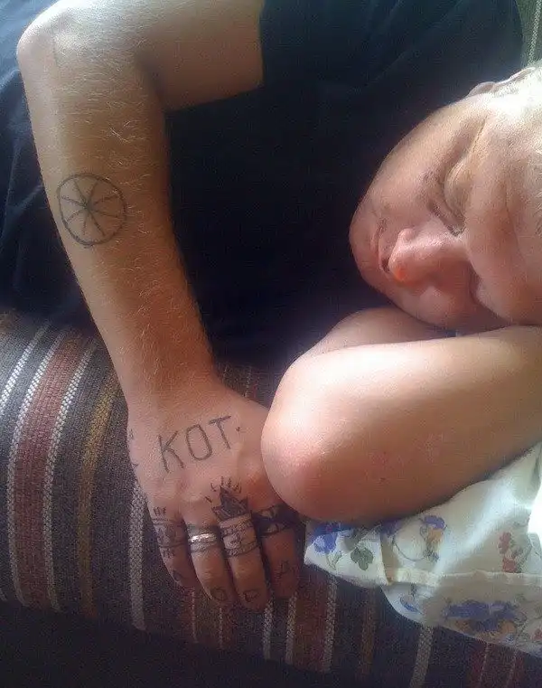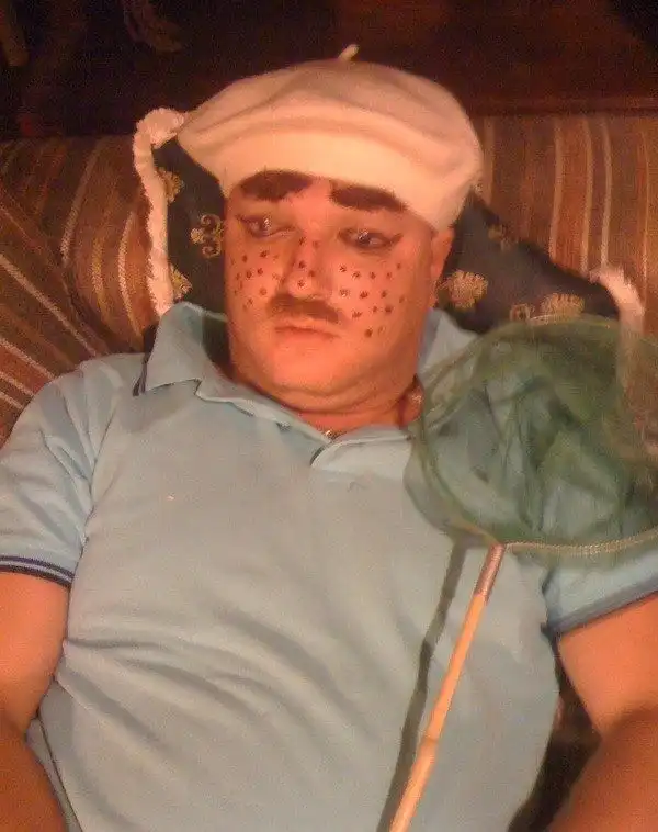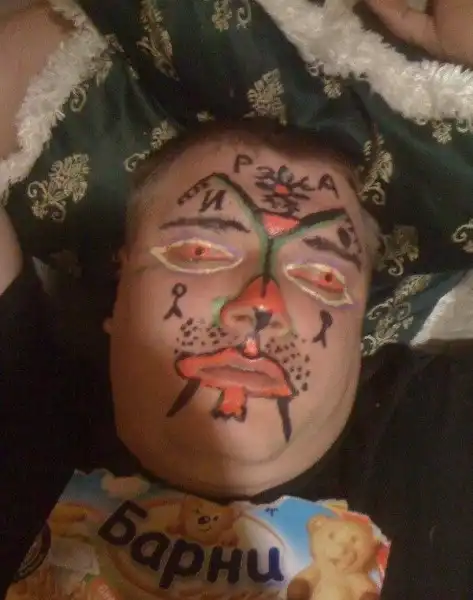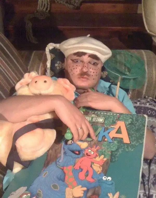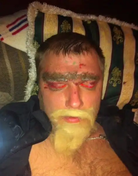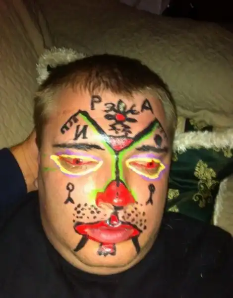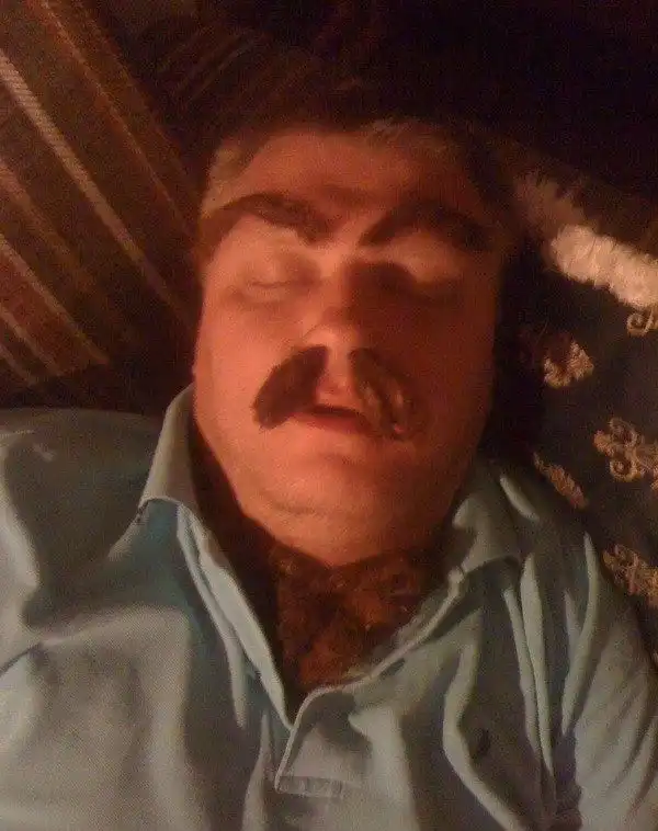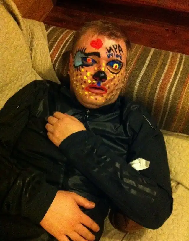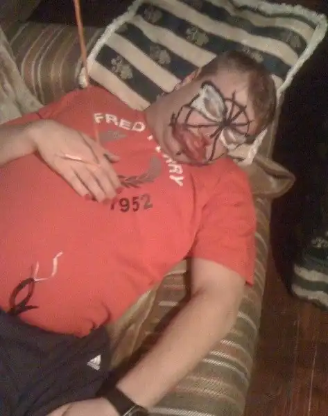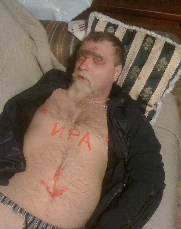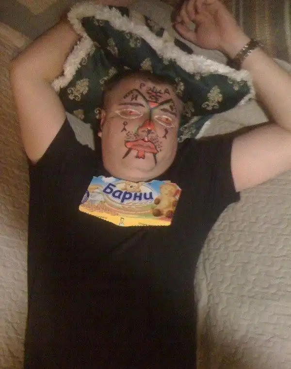 Кто-то жаждет приключений и не боится перемен, но для кого-то нет ничего лучше, чем постоянство. Этот гражданин из года в год приходит в гости, напивается и ложится на один и тот же удобный диванчик, автоматически превращая себя в холст для выплеска творческих эмоций его друзей.
