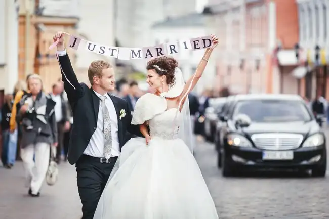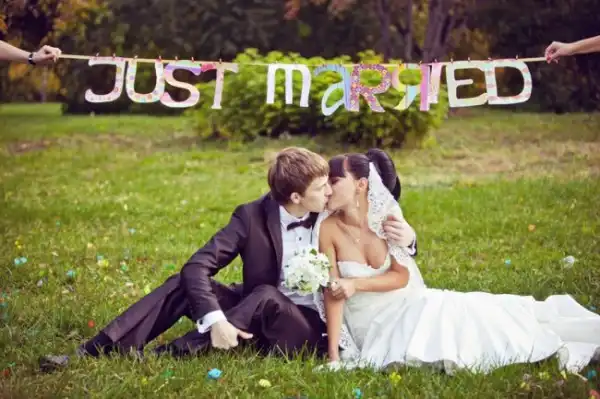 После загса безудержно креативный фотограф извлекает самый главный транспарант, табличку "Just Married", и трясёт ею перед молодой парой уже до самого окончания прогулки. Молодожёны целуются над ней, под ней, вместе с ней, и берут её с собой в постель на первую брачную ночь.