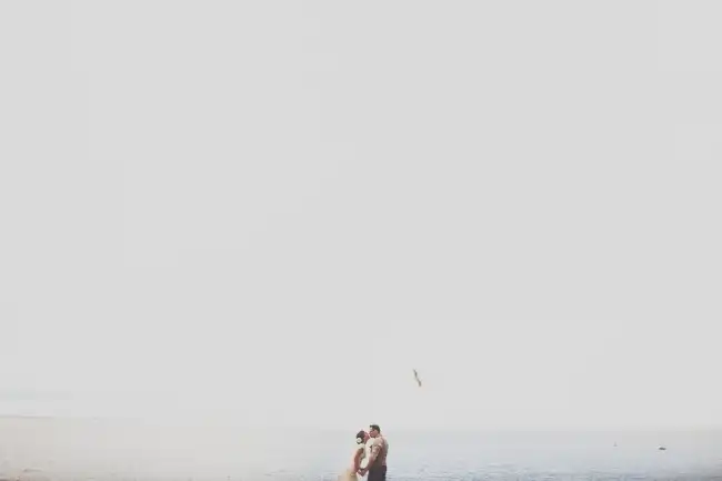 Для получения этого снимка фотограф должен нарушить все мыслимые и немыслимые правила композиционного построения изображения, и умышленно сместить молодожёнов в какой-нибудь угол кадра, причём расположить их так, чтобы они по возможности занимали не более десяти процентов площади снимка. Чем более пустой и малоинформативной будет оставшаяся часть кадра, тем лучше. Идеально, если она будет просто ослепительно белой, ведь фотограф запихивает своих молодожёнов в угол кадра не для того, чтобы расположить на освободившейся площади какой-то объект, а для того, чтобы продемонстрировать новизну своей фотографической мысли, и полную свободу от дурацких стереотипов типа "золотого сечения".