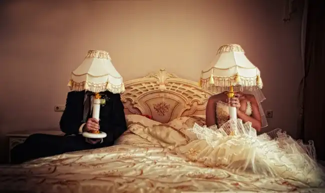 Фотограф ставит молодую пару в какую-нибудь изящную позу, и командует им закрыть глаза. Получившийся снимок двух снулых рыб, которые откровенно млеют, долженствует являть собою фотографическую фиксацию внезапно нахлынувшей невыносимой нежности и испепеляющей страсти. Молодожёны томятся напоказ, фотограф счастлив.