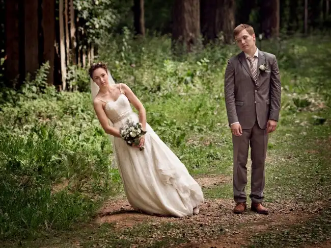 Здесь в смелой попытке достичь новых высот в преодолении устаревших догм, и установлении нового подхода к запечатлению свадеб, с помощью вдохновенного творческого кадрирования профессионал просто отрезает молодожёнам головы. Получается незабываемый кадр, великолепно иллюстрирующий недюжинную творческую смелость фотографа. А молодожёны, когда видят себя запечатлёнными в таком виде, от благодарности и счастья обычно не могут сдержать слёз.