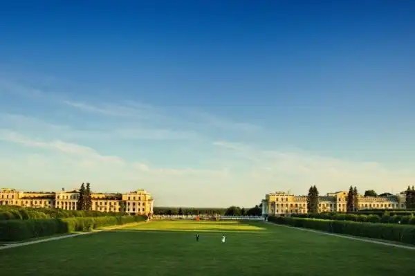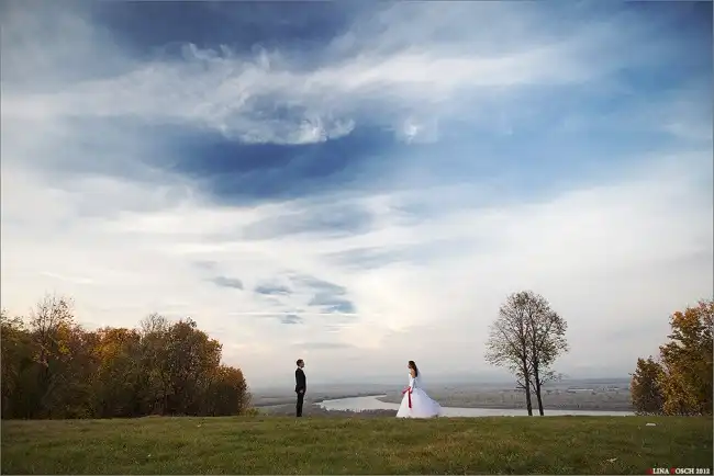 В идеале - их вообще должно быть почти не видно, чтобы зритель, разглядывая получившийся снимок, в растерянности шарил глазами по полю кадра, и не мог обнаружить радостных членов новоиспечённой ячейки общества как минимум пять секунд. Если же зритель укладывается в более короткое время, тогда этот кадр считается неудавшимся, и его следует переснять, удалившись от молодожёнов ещё на один километр.