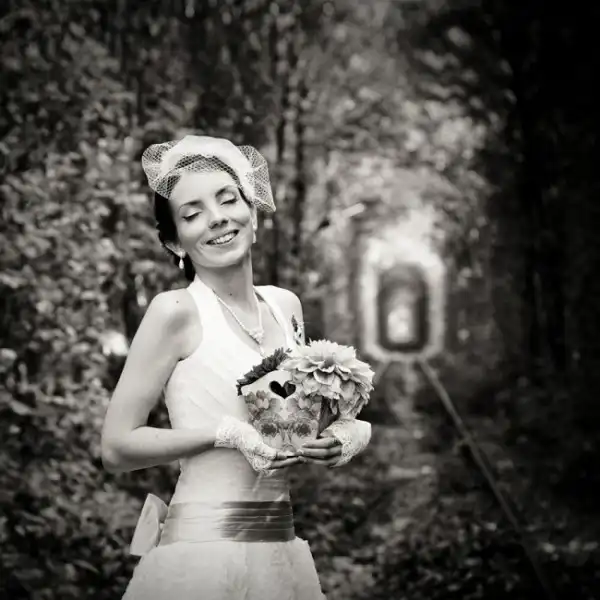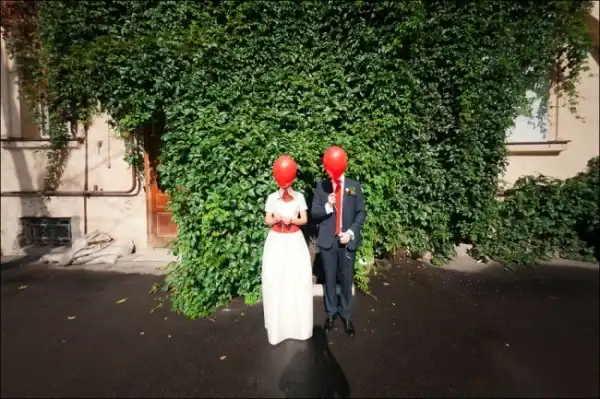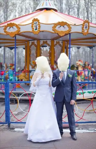 Если же журнала под рукой не нашлось, а изготовить данный снимок фотографу нестерпимо хочется, то можно прикрыть лицо невесты букетом. Если же хочется прикрыть и лицо жениха, а второго букета нет, тогда приходится прибегать к различным подручным материалам, тут уже при подборе реквизита открывается прекрасный простор для фантазии и креатива. Виниловые пластинки, шарики, подсолнухи и леденцы, всё это может сослужить неоценимую службу фонтанирующему идеями мастеру свадебного фото.