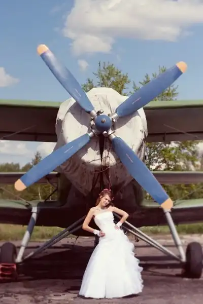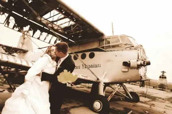 Запечатлевая молодожёнов на фоне самолёта, фотограф получает кадр, символизирующий собою предстоящий жизненный полёт молодой семьи, полный свершений, надежд, мечты и счастья. Изготовление данного снимка вполне несложно, жених с невестой изображают радость, а самолёт на заднем плане готов в любую секунду сорваться с места, и унести молодожёнов в удивительные дали, навстречу ослепительному счастью.