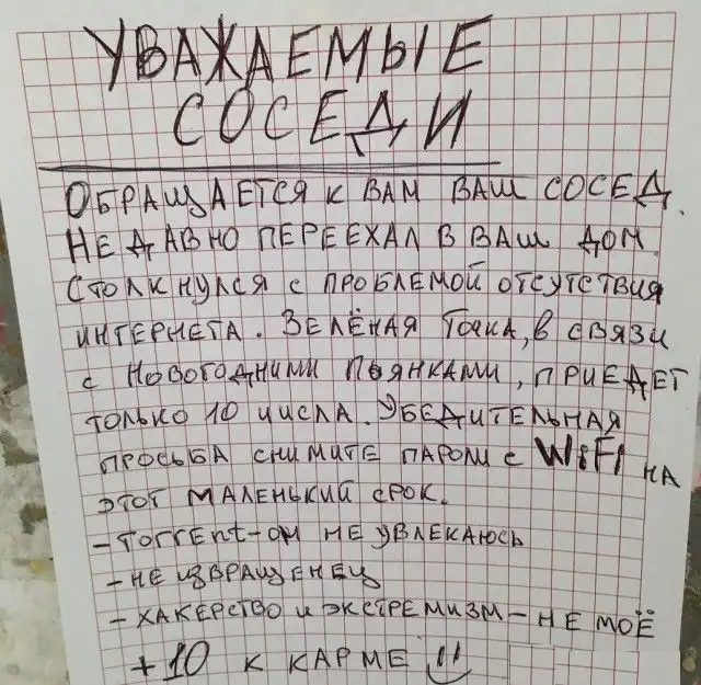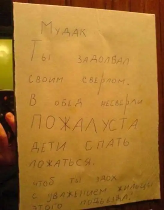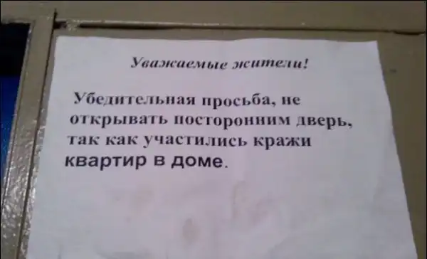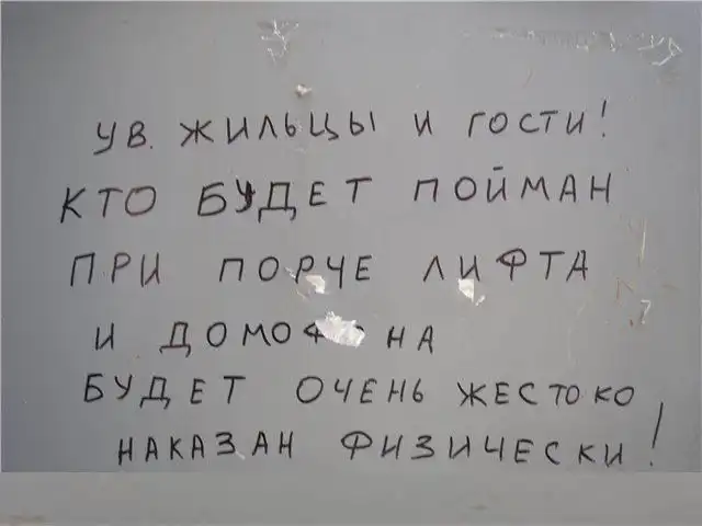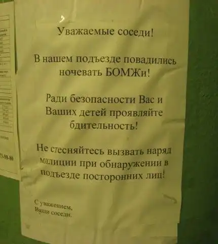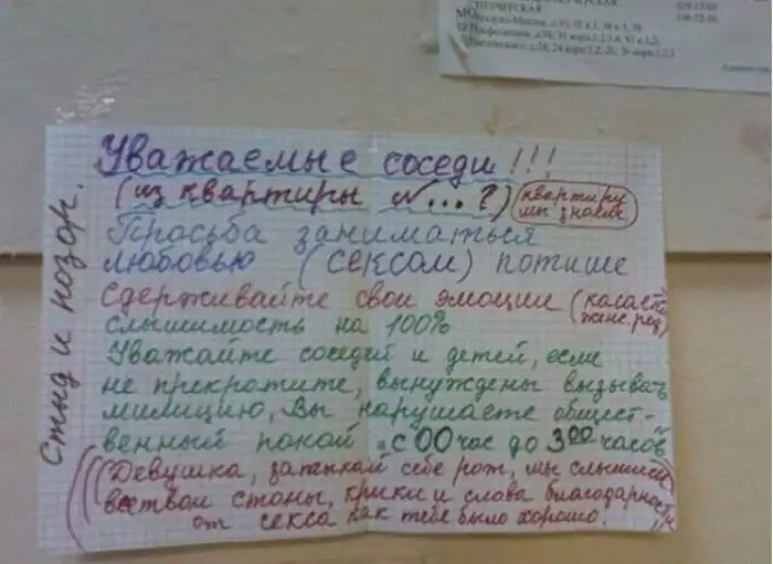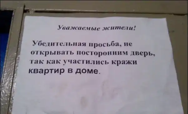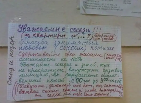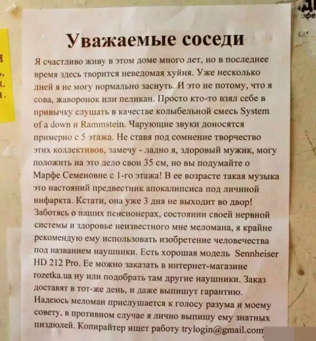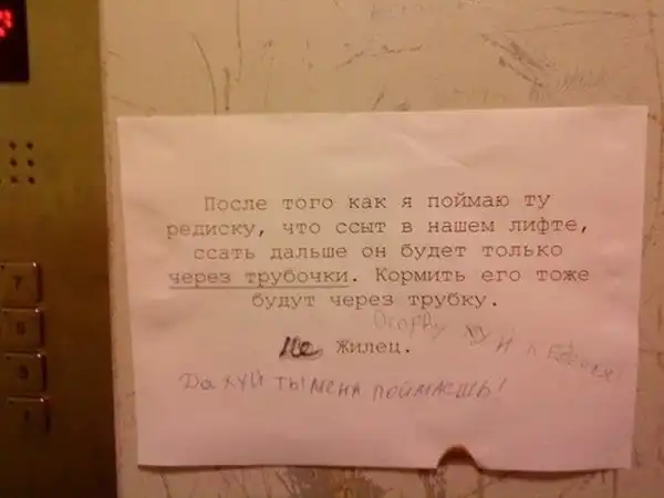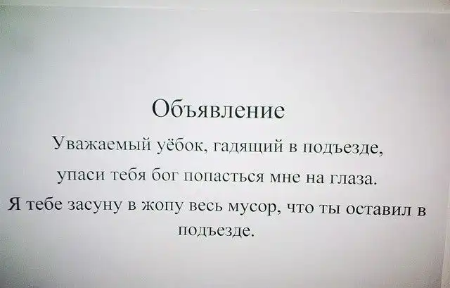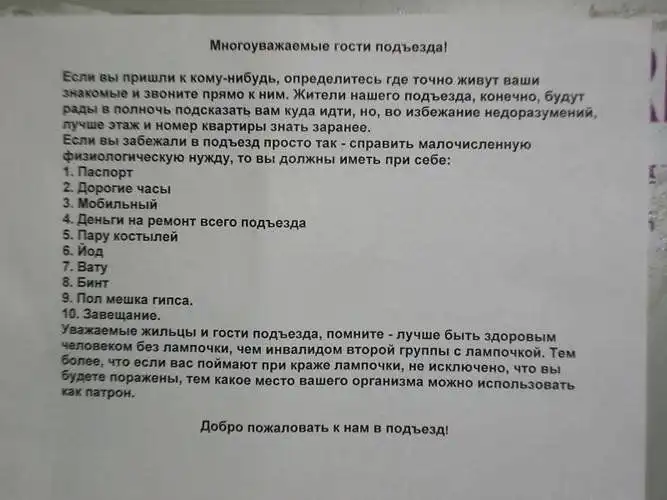 Несмотря на это, с соседями приходится обсуждать какие-то совместные жилищные вопросы, мешающие жить другим людям, либо посредством личного общения, либо через объявления, некоторые из которых и представлены вашему вниманию. Внимание:Присутствует ненормативная лексика!!