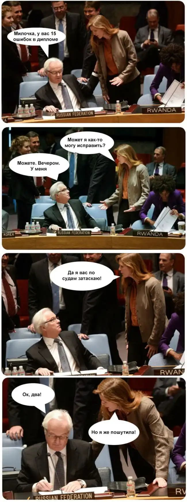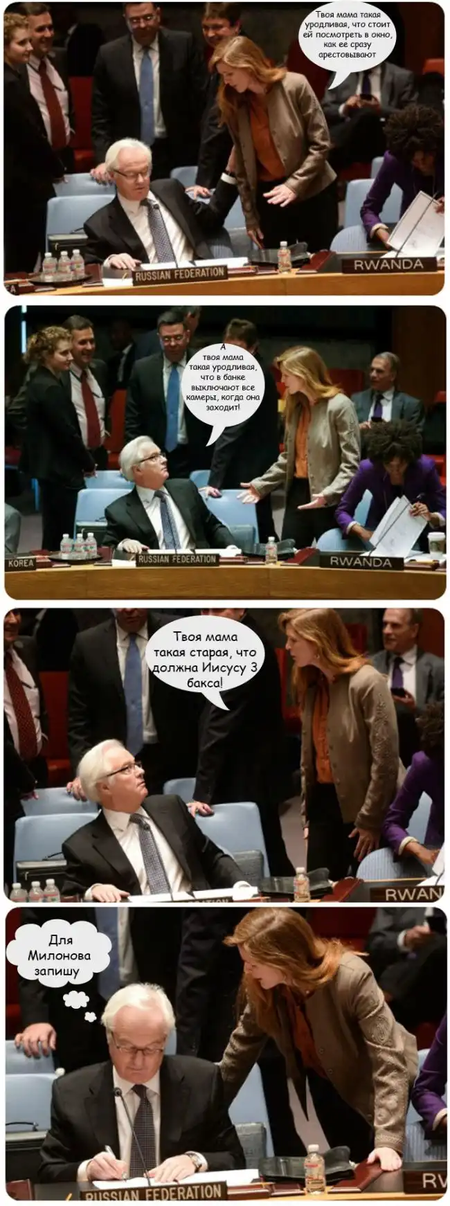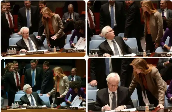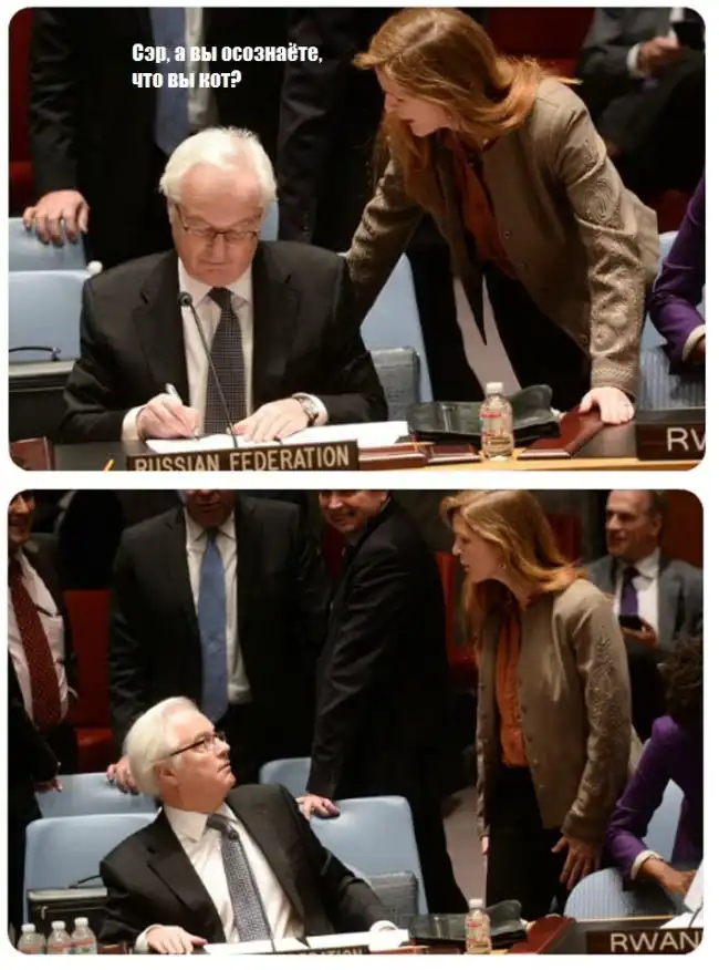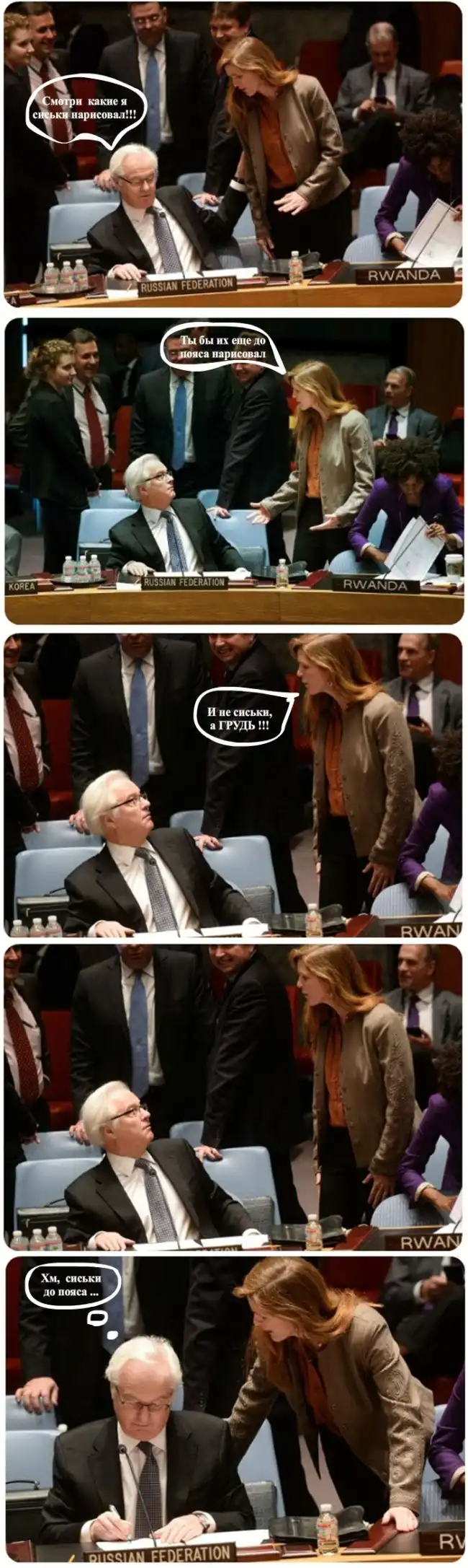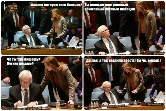 На днях все мы стали свидетелями того, как Саманта Пауэрс угрожала Виталию Чуркину и России. По ее словам - поведение России просто возмутительно, на что Чуркин деликатно отодвинул даму за локоток и попросил "не плеваться" во время разговора )) Конечно же, блоггеры и посетители соц сетей не смогли пройти мимо такого момента, поэтому в сети появилась большая коллекция прикольных фотожаб на эту тему.