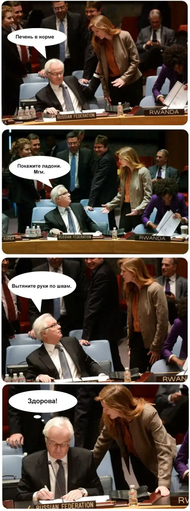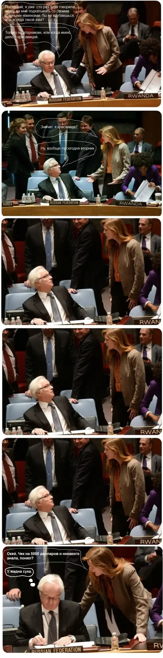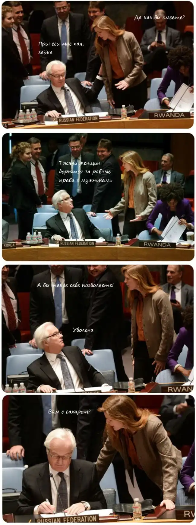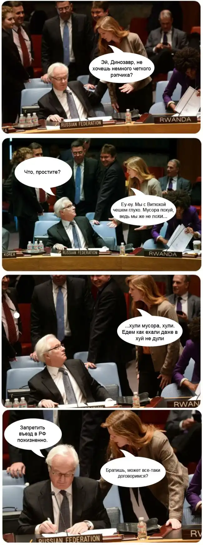 На днях все мы стали свидетелями того, как Саманта Пауэрс угрожала Виталию Чуркину и России. По ее словам - поведение России просто возмутительно, на что Чуркин деликатно отодвинул даму за локоток и попросил "не плеваться" во время разговора )) Конечно же, блоггеры и посетители соц сетей не смогли пройти мимо такого момента, поэтому в сети появилась большая коллекция прикольных фотожаб на эту тему.