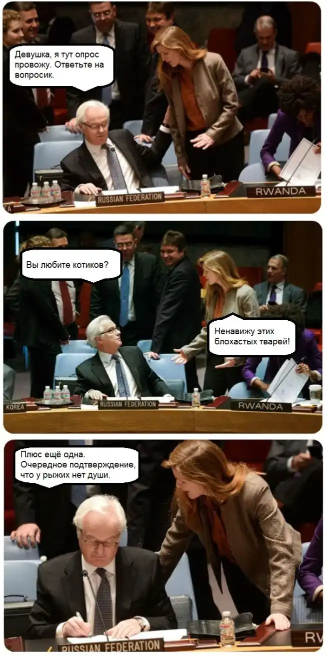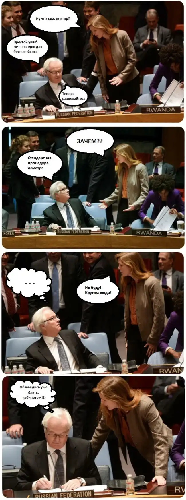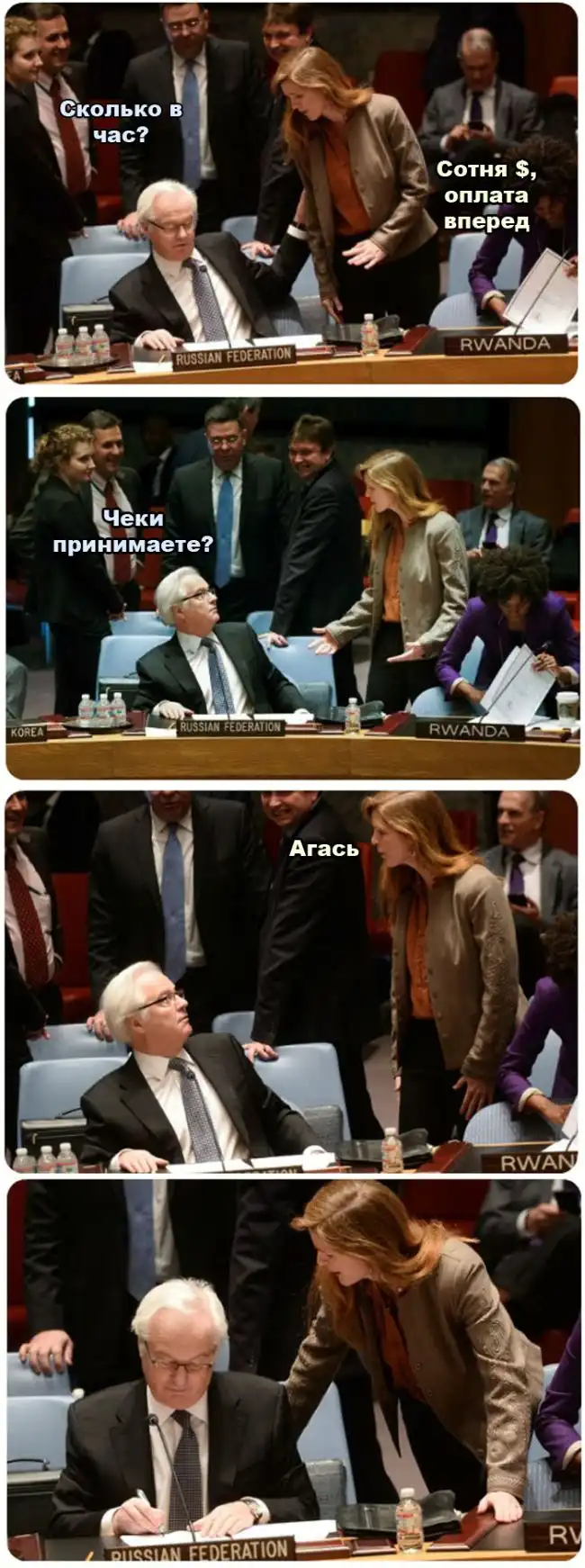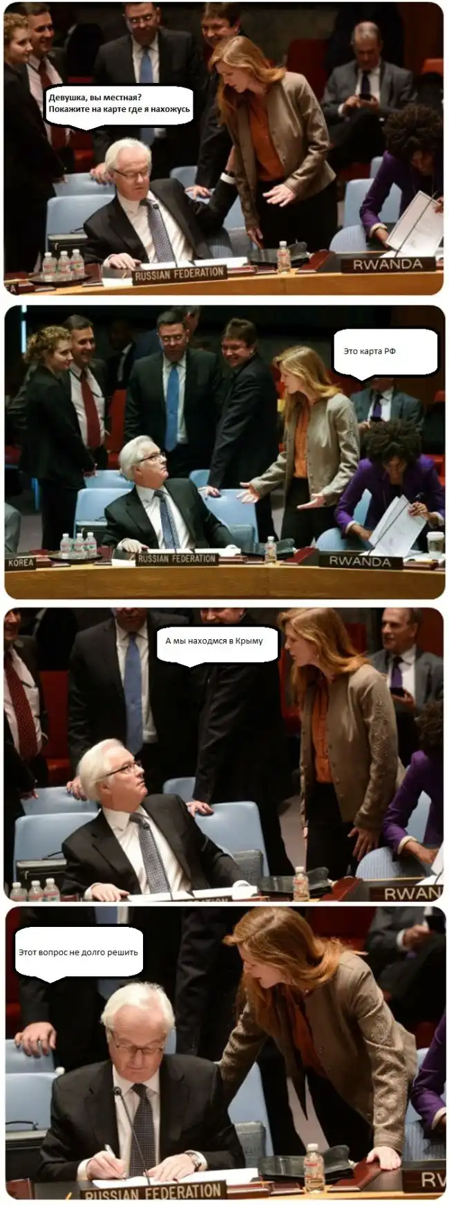 На днях все мы стали свидетелями того, как Саманта Пауэрс угрожала Виталию Чуркину и России. По ее словам - поведение России просто возмутительно, на что Чуркин деликатно отодвинул даму за локоток и попросил "не плеваться" во время разговора )) Конечно же, блоггеры и посетители соц сетей не смогли пройти мимо такого момента, поэтому в сети появилась большая коллекция прикольных фотожаб на эту тему.