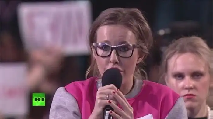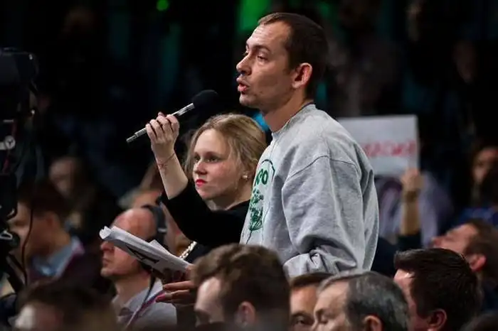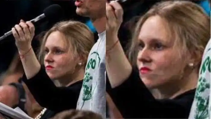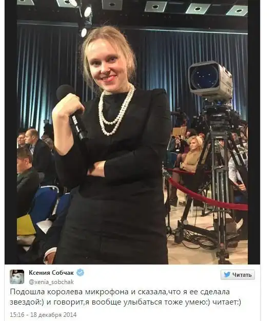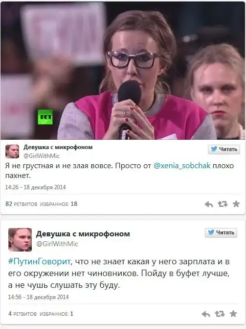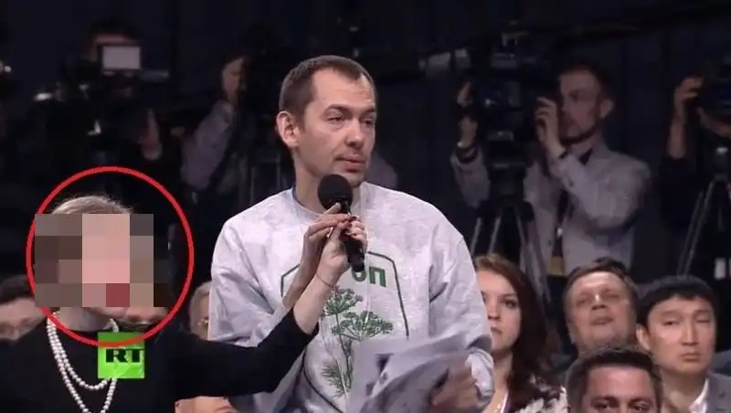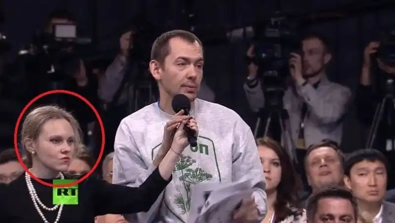 Работа этой девушки заключается в том, чтобы разносить микрофон в студии, где проходила большая пресс-конференция В. В. Путина, но, судя по ее выражению лица, она не очень уж рада своей профессии.