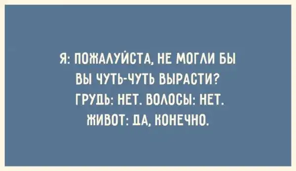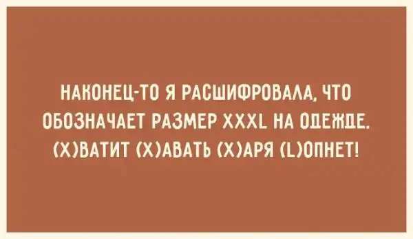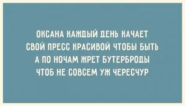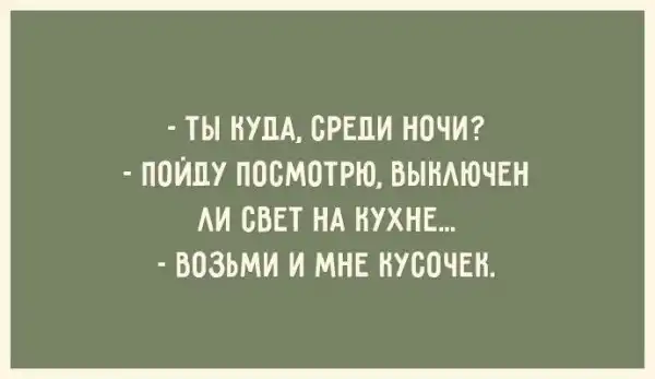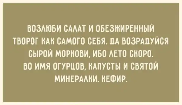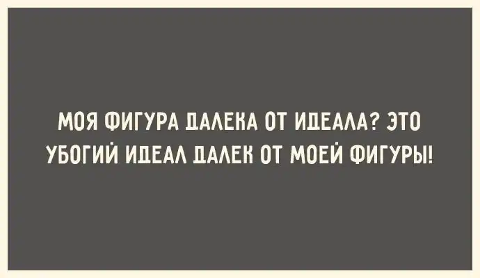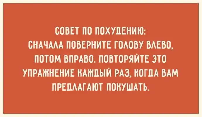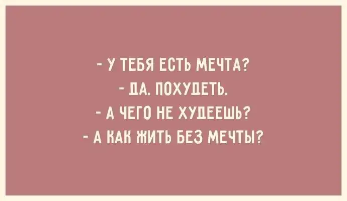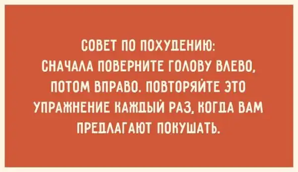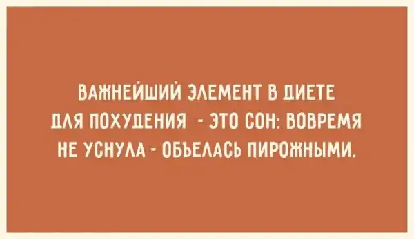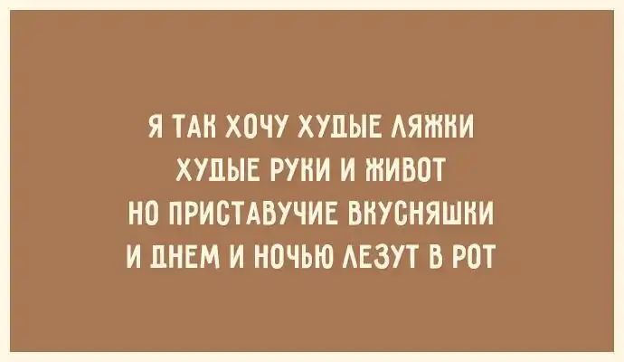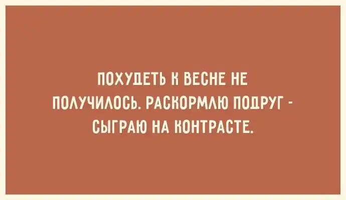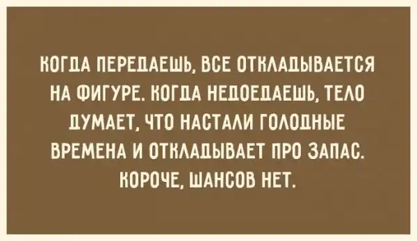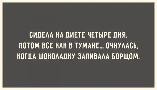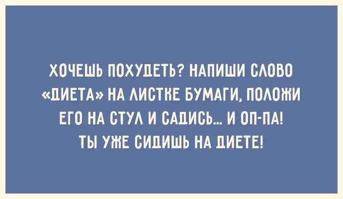 Этот юмор будет понятен каждому, кто хоть раз интересовался такими понятиями как «диета», «правильное питание» или «похудение». Не стоит забывать, что хорошее настроение и смех – важнейшие составляющие красивой фигуры.