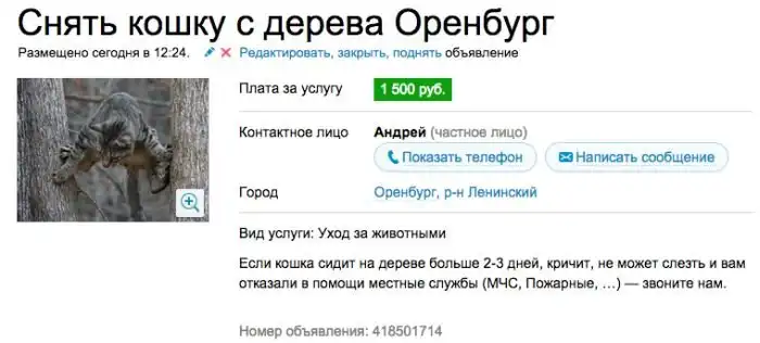 Так в Оренбурге за вознаграждение помогут снять кошку с дерева.