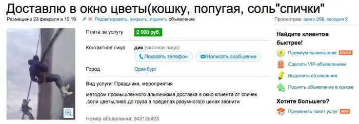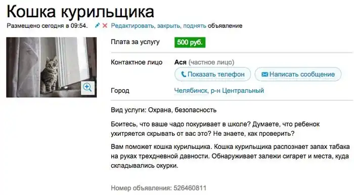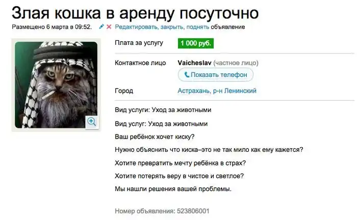 Позже появился клон «злой кошки» Баядерки. Это животное живет в Астрахани, а предприимчивый хозяин просит за услугу не 500 рублей, как в шуточном объявлении, а 1000.