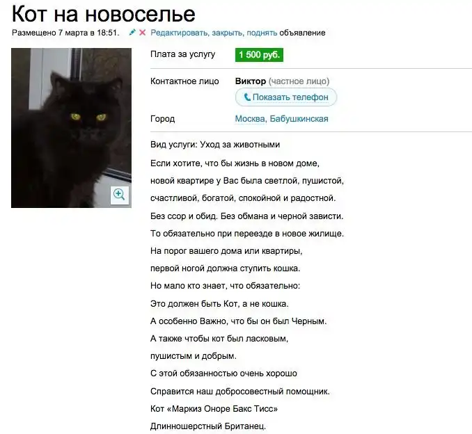 В Москве за 1500 рублей предлагают на новоселье арендовать кота.
