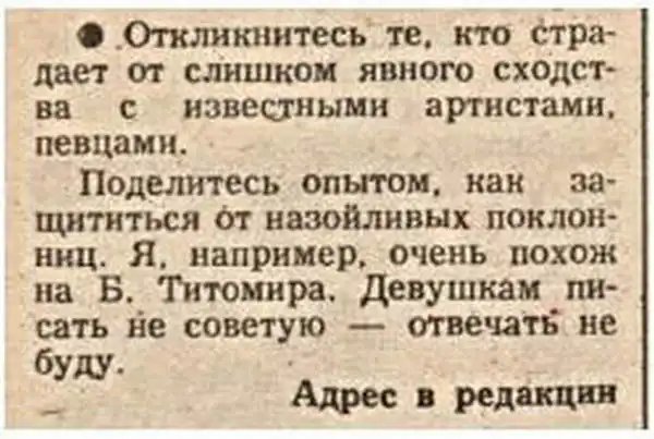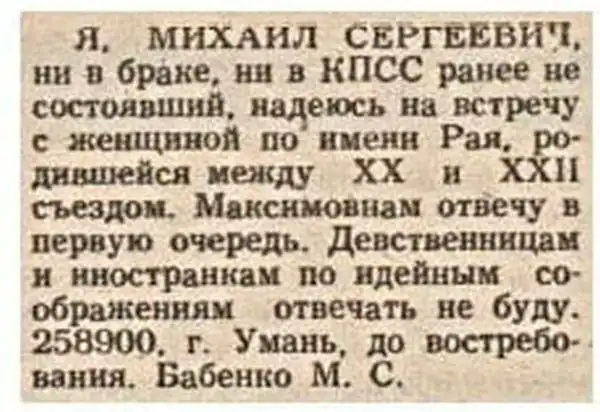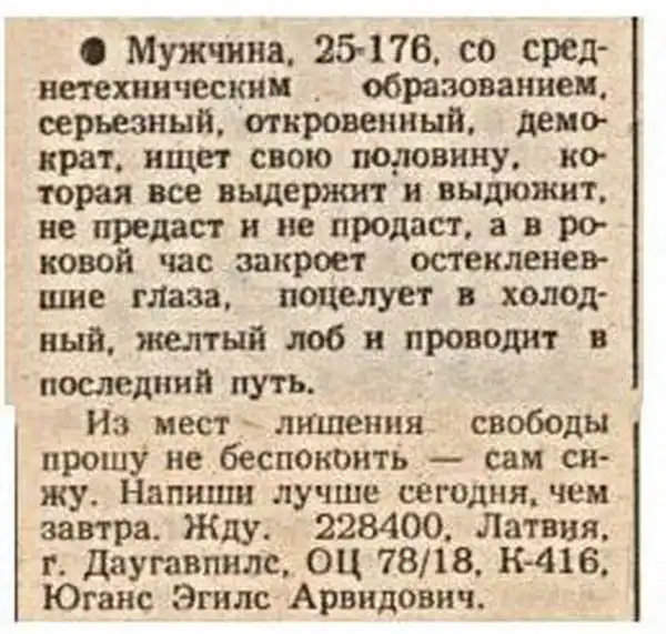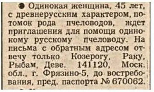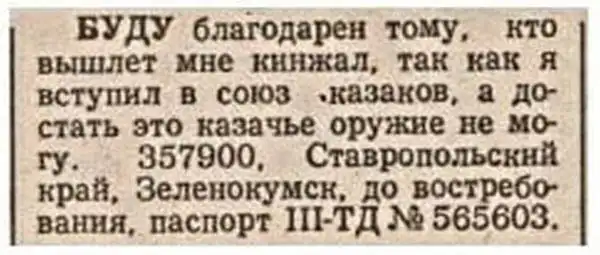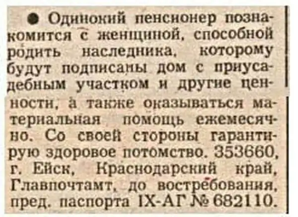 В 90-е годы в газетах, журналах и других печатных изданиях стран бывшего Советского Союза можно было встретить самые разные объявления, в том числе и весьма забавные.