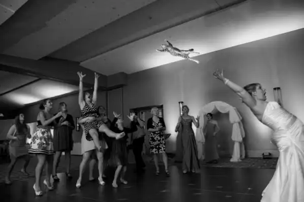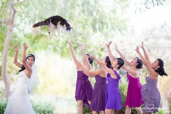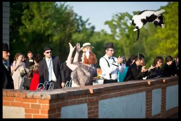 Создатель этих забавных фотожаб тщательно подбирал котов в полете, поэтому они так органично летят в руки к обезумевшим от конкуренции подругам невесты.