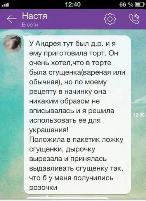Одна девушка решила украсить праздничный торт для своего парня красивыми розочками из сгущенки. Честно говоря, розочки у нее получились какие-то странные, да и вроде бы не розочки это вовсе.