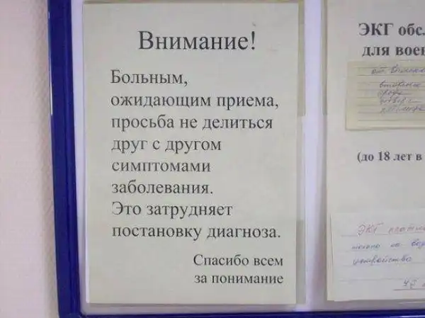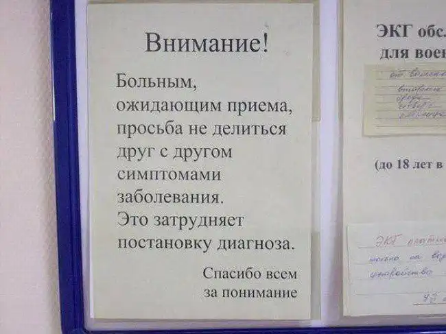 Даже совершенно здоровый человек, который зашел, к примеру, просто сделать флюорографию раз в год, хочет быстрее убежать из этого хаоса. Как же тогда справляются медработники с такой суетой? Правильно! Они включают чувство юмора, чтобы не сойти с ума.