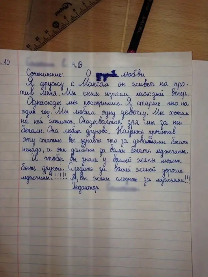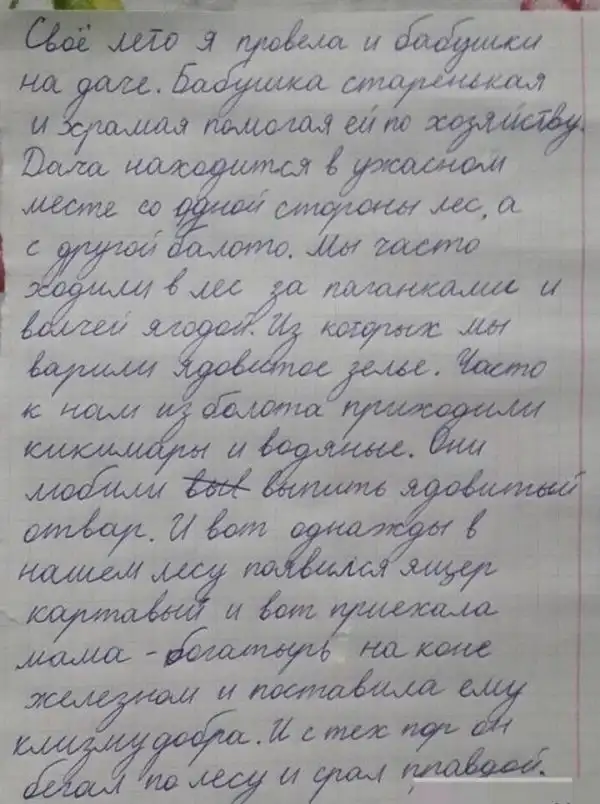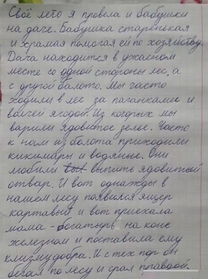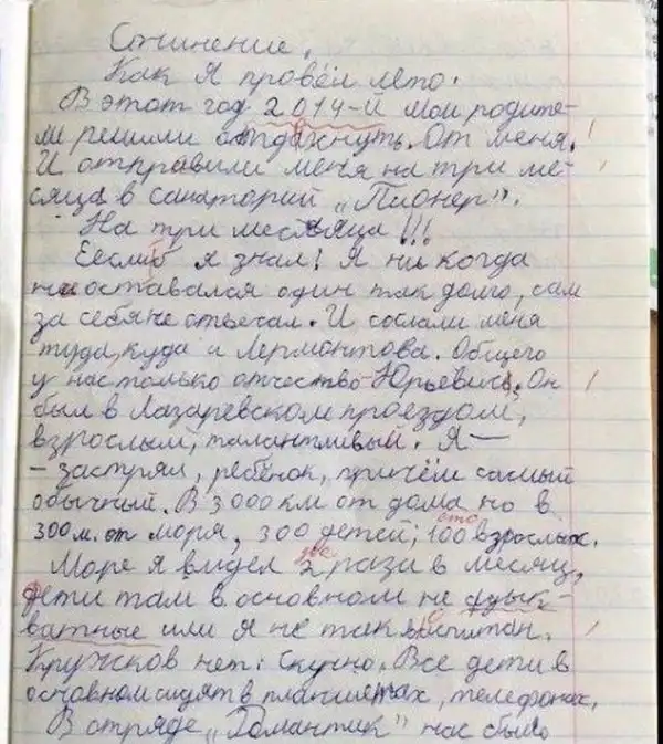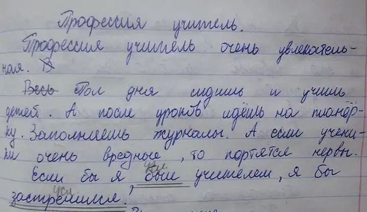 Дети умеют писать сочинения, которые не оставят равнодушными никого. Они так искренне пишут и так ясно видят правду жизни, открывающуюся не всякому взрослому, что даже учителям не всегда легко ставить за неверное, но душевное сочинение “2”!