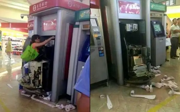 В Китае у одной из девушек банкомат "съел" карточку, она голыми руками вскрыла его, достала свою карту и продолжила хождение по магазинам.