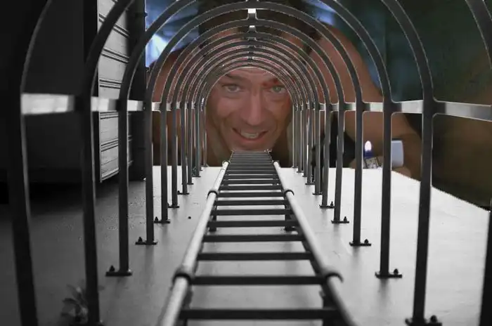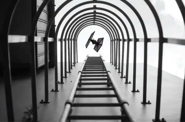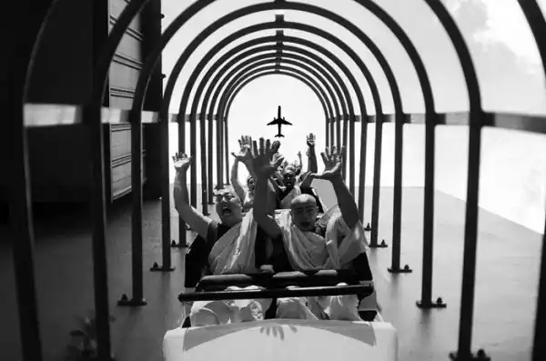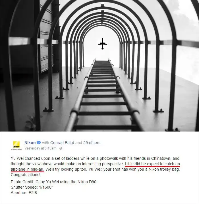 "Ю Вей забрался на лестничную конструкцию во время прогулки с друзьями по Чайнатауну, посчитав, что вид наверху имеет интересную перспективу. Чего он не ожидал, так это запечатлеть летящий в воздухе самолет. Мы тоже попробуем смотреть вверх, Ю Вей; твой снимок выиграл для тебя дорожный чемодан Nikon. Поздравляем!"