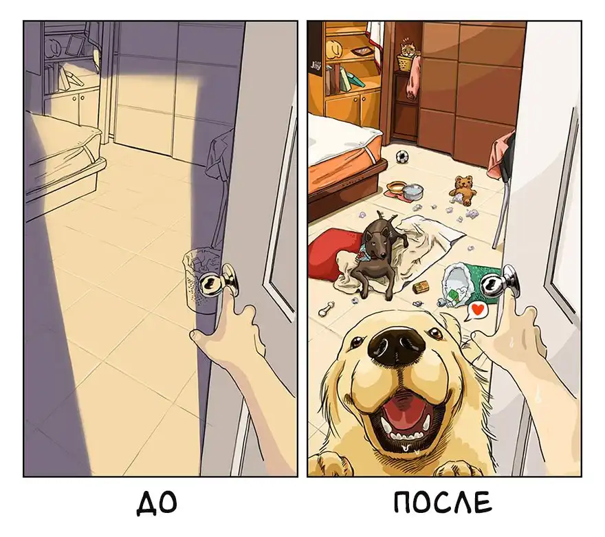 Итак, вы решили завести собаку. Владельцу золотистого ретривера Джону есть, что вам сказать. В своих очаровательных иллюстрациях он продемонстрировал, как изменилась его жизнь, когда он завел щенка по прозвищу Меймай, также известного как "милейшее и пушистое маленькое зло". Можете уже начинать чувствовать себя виноватым за то, что не делитесь едой с новым другом. Забудьте о чистоте в квартире.