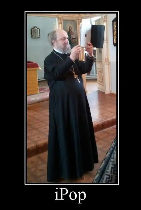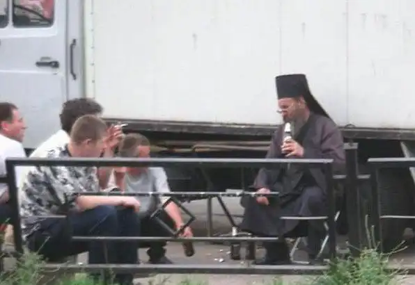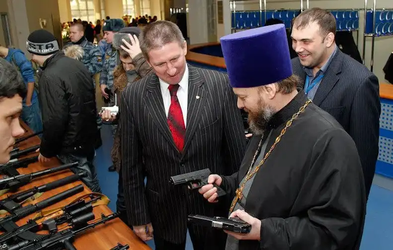 Хочется верить, что батюшка просто смотрит оружие, а не выбирает)