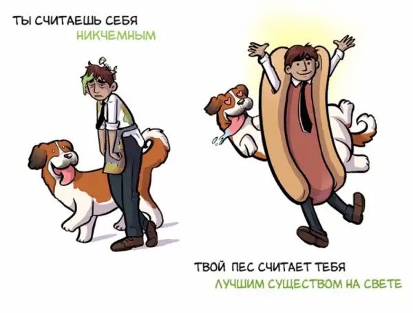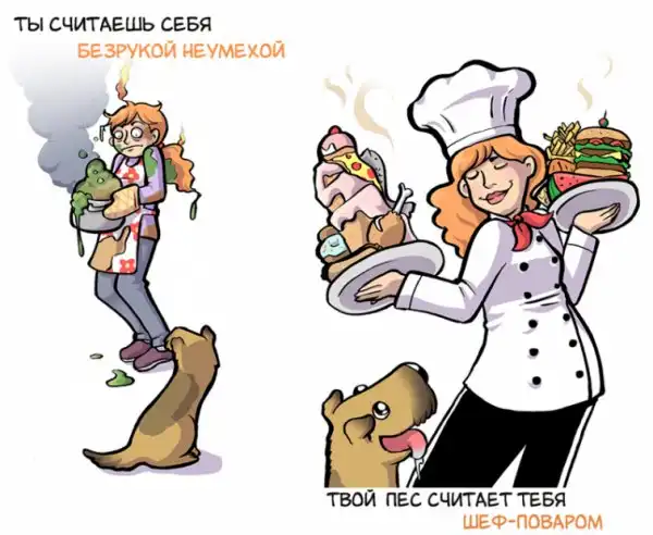Мы все знаем, что думают о нас кошки. Они ненавидят нас и хотят свергнуть человеческий род, чтобы самим управлять этим миром. А как насчет собак? Вы когда-нибудь задавались вопросом, как они видят нас? Мы часто думаем об отношениях с нашими собаками в очень линейных терминах — мы их владельцы, а они наши домашние животные, но иллюстратор Келли Энджел (Kelly Angel) считает, что мы значим для собак гораздо больше и в доказательство этого нарисовала эти милые рисунки.