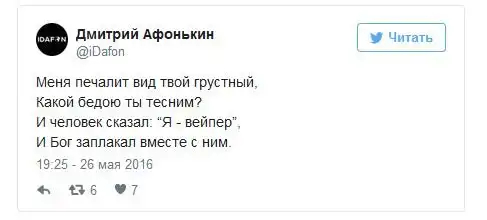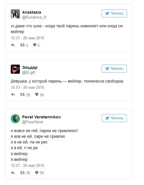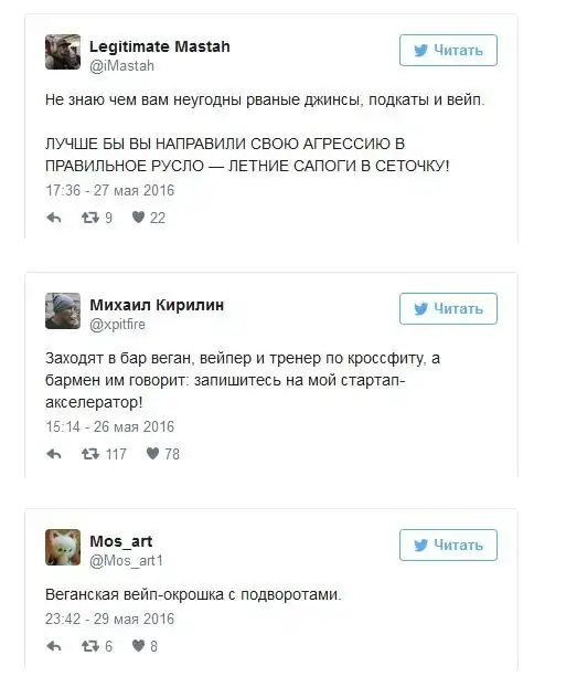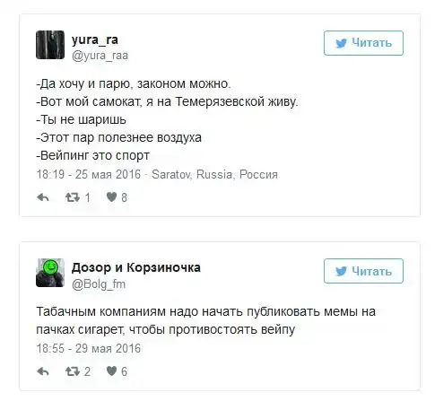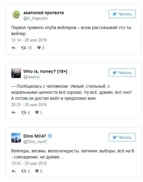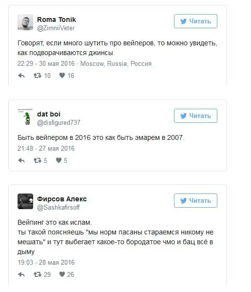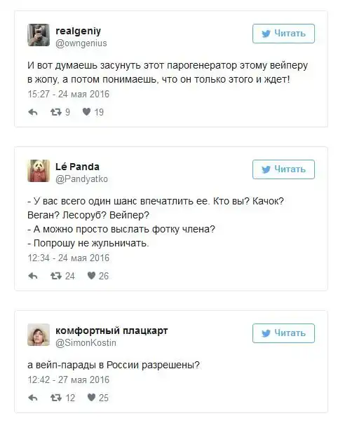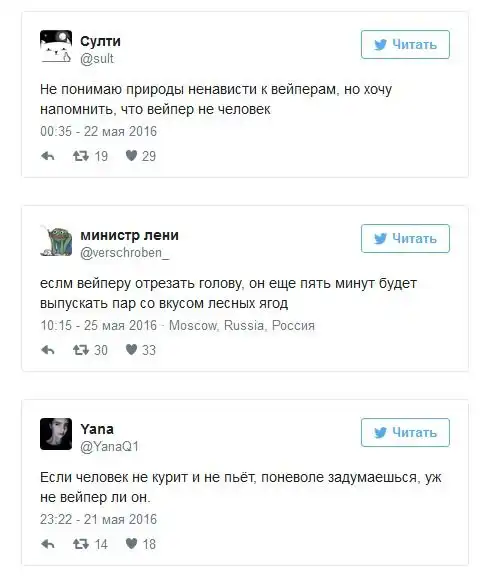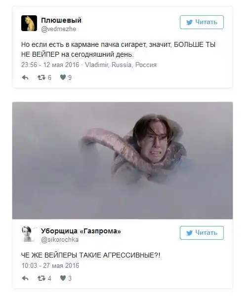 После вступления в силу антитабачного закона в России все больше людей стали курить электронные сигареты. Купить сами устройства для курения и заправки к ним можно практически в любом городе страны, а в крупных городах уже стали появляться вейп-кафе. Любители электронных сигарет, которых называют вейперами, стали объединяться в отдельные тусовки, словом у них зародилась своя собственная субкультура и даже проходят свои фестивале, 26 мая такой фестиваль прошел Ростове-на-Дону, а 28 мая - в Санкт-Петербурге. К появлению этой субкультуры все отнеслись по-разному, а в сети уже начали шутить над вейперами.