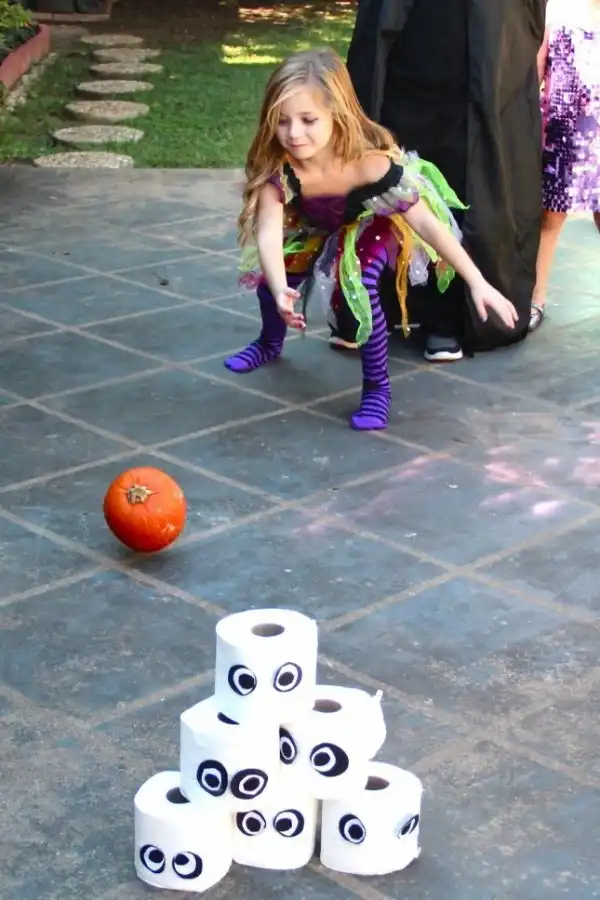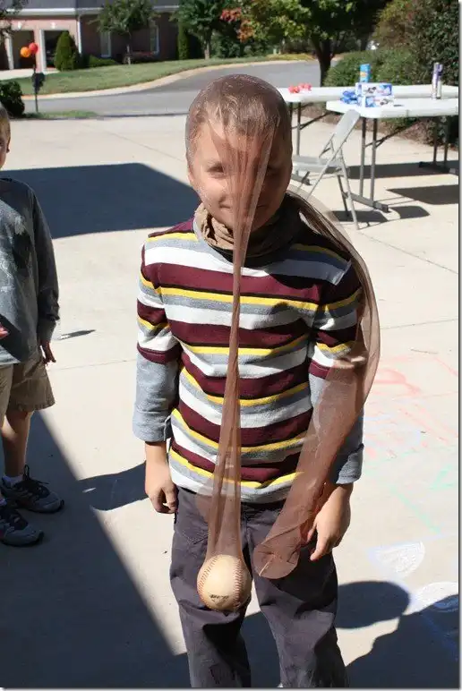 Очень интересная игра: раскачивая чулок с мячиком при помощи головы, нужно сбить все банки, котораые стоят на земле.