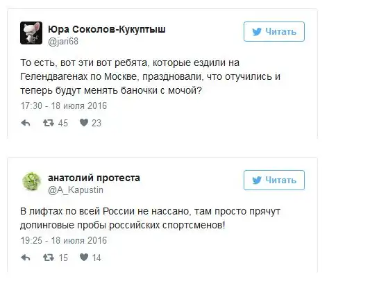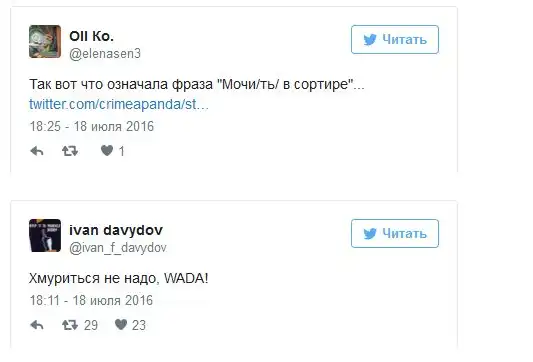 18 июля Всемирное антидопинговое агентство WADA опубликовало доклад с результатами расследования случаев применения допинга российским спортсменами на Олимпиаде в Сочи. В докладе говорится о фактах подмены анализов мочи спортсменов для манипуляции анализа на допинг. В докладе указаны лица, которые имеют причастность к подмене. Ознакомившись с докладом, президент России Владимир Путин отметил, что «должностные лица, названные в докладе комиссии как прямые исполнители, будут временно отстранены от занимаемой должности до полного завершения расследования». В то же время WADA призвала отстранить российских спортсменов от участия в Олимпиаде в Рио, однако окончательное решение будет вынесено спортивным арбитражным судом в Лозане в ближайшие дни. Далее вас ждет реакция блогеров на данную новость.