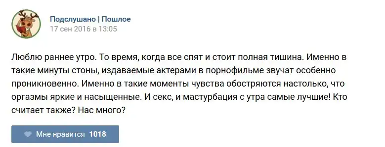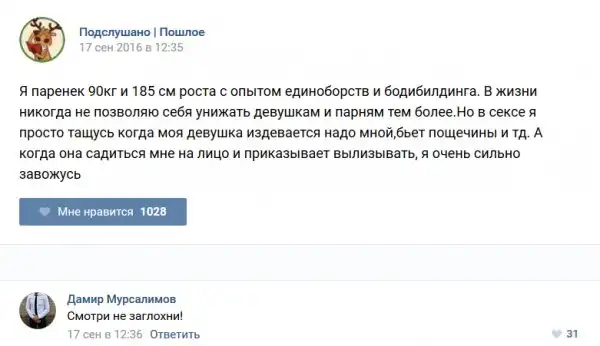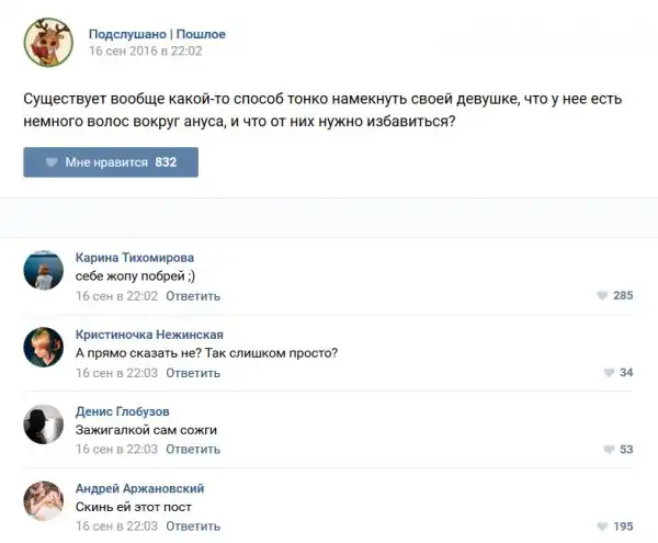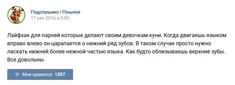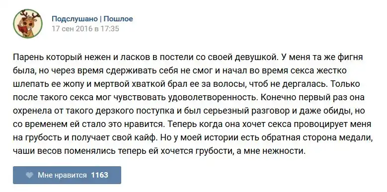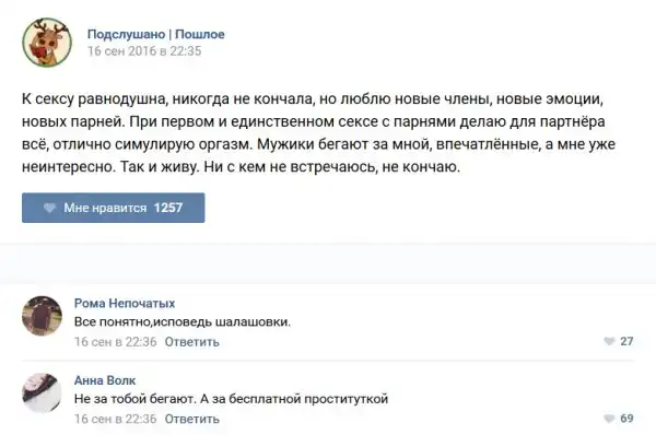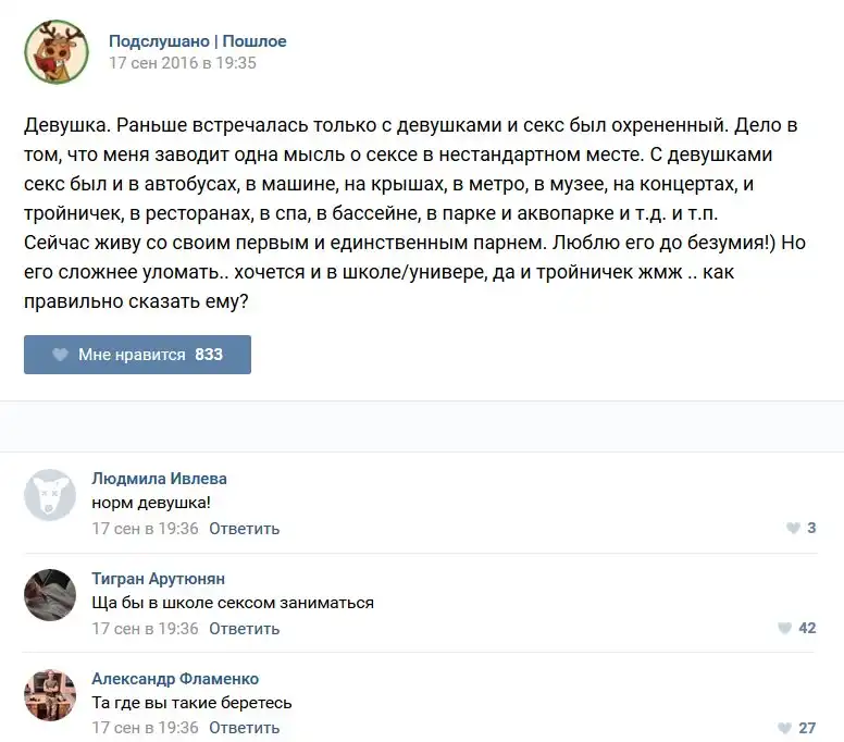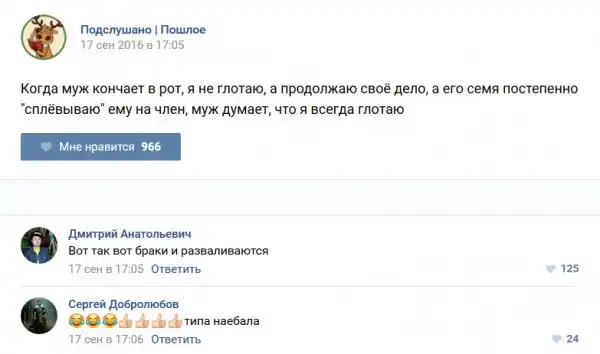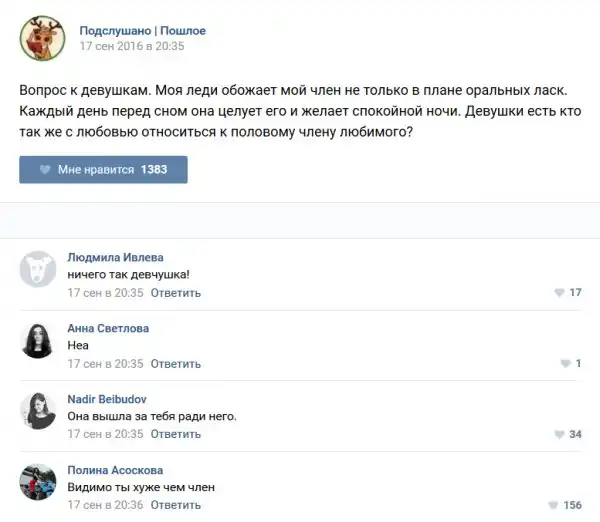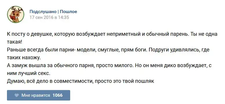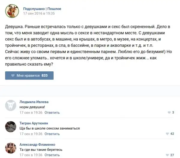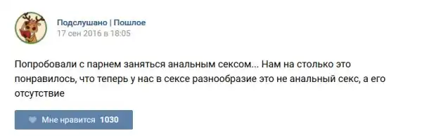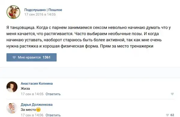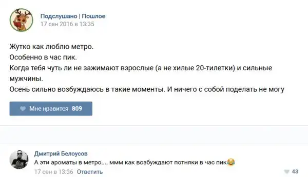 У каждого человека есть своя любимая группа или любимое сообщество в какой-либо социальной сети. Иногда это группа не совсем приличная, поэтому нет возможности в открытом режиме подписаться на неё и прочитывать свежие посты. Мы предлагаем вам очередную порцию из серии интересных постов в группе «Подслушано пошлое». Сегодняшняя запись: Подслушано пошлое предлагает посмотреть несколько интересных и запоминающихся постов, вместе с комментариями из данной группы в социальной сети ВКонтакте.