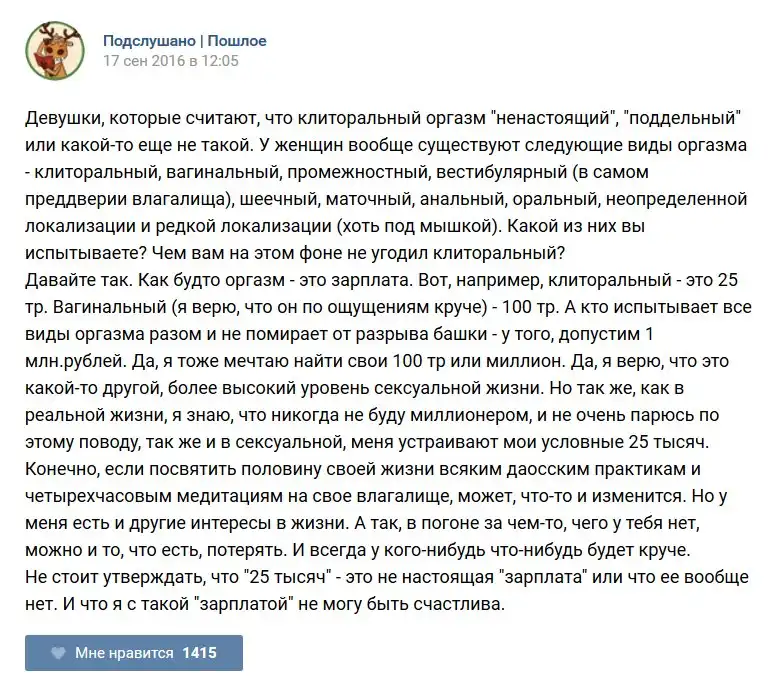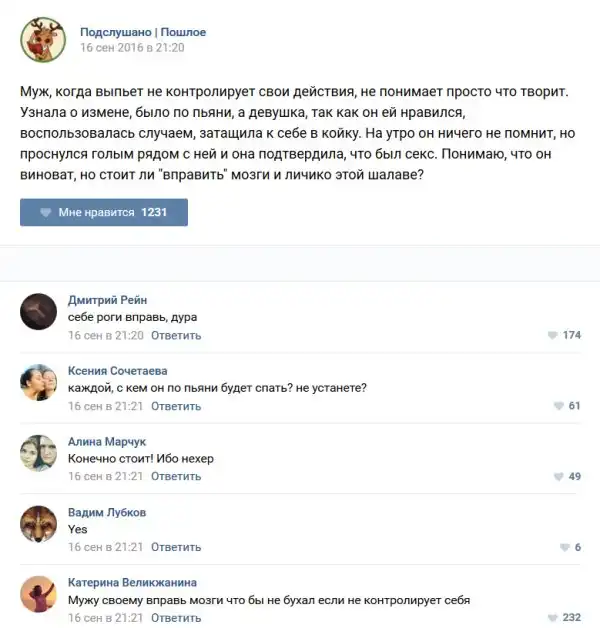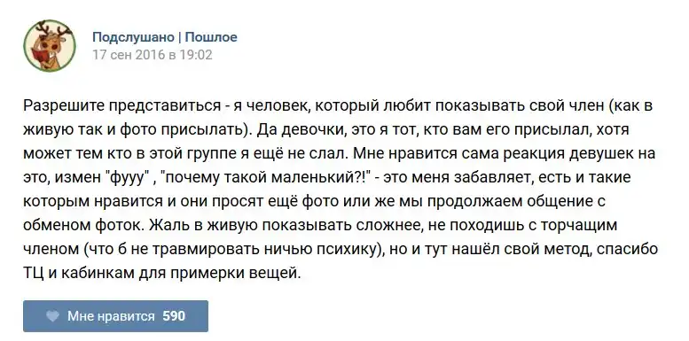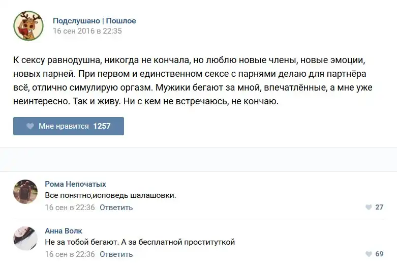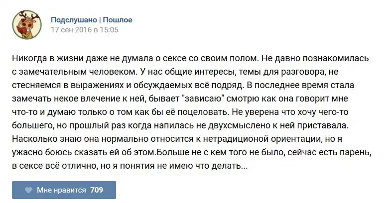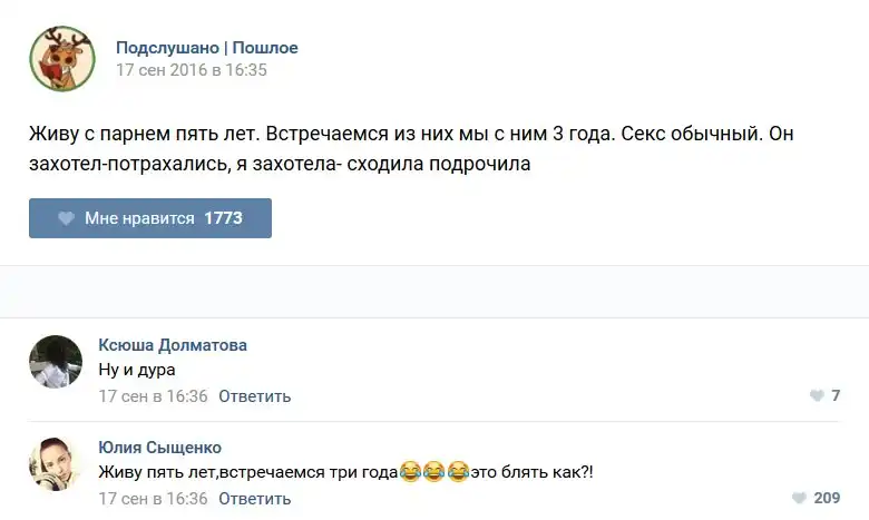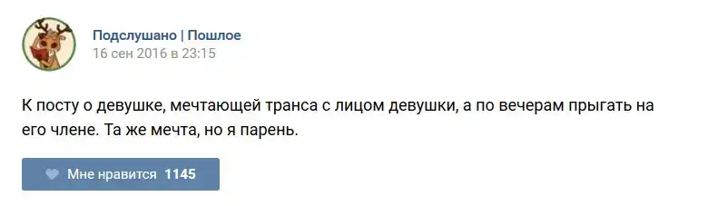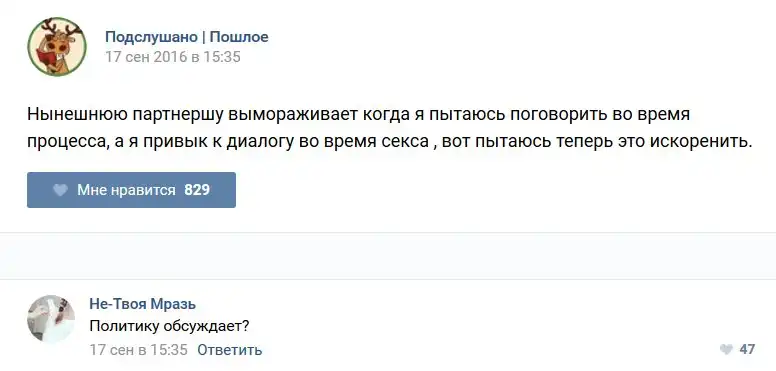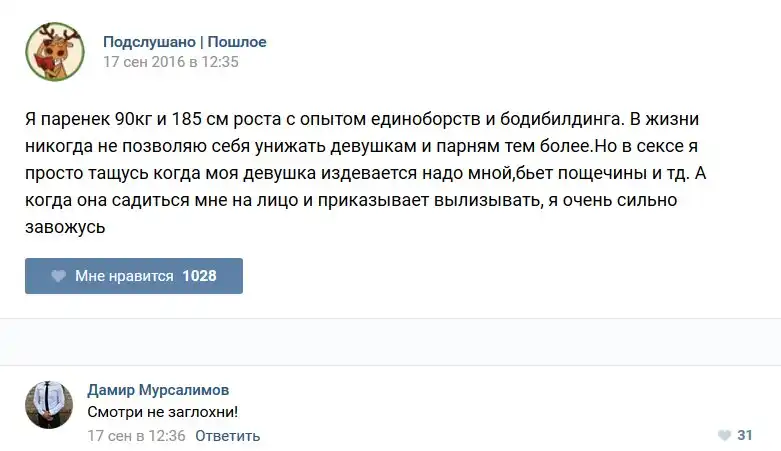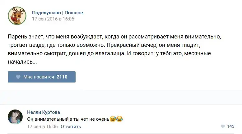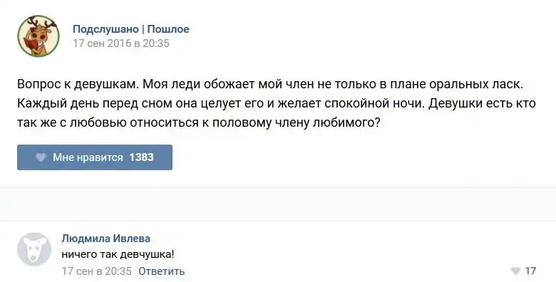У каждого человека есть своя любимая группа или любимое сообщество в какой-либо социальной сети. Иногда это группа не совсем приличная, поэтому нет возможности в открытом режиме подписаться на неё и прочитывать свежие посты. Мы предлагаем вам очередную порцию из серии интересных постов в группе «Подслушано пошлое». Сегодняшняя запись: Подслушано пошлое предлагает посмотреть несколько интересных и запоминающихся постов, вместе с комментариями из данной группы в социальной сети ВКонтакте.