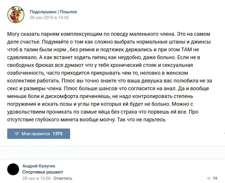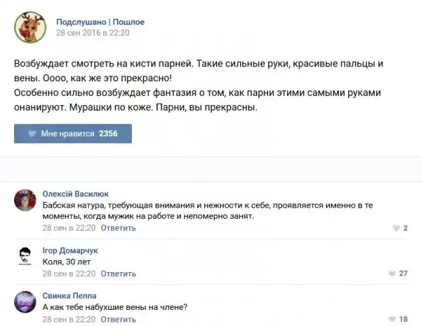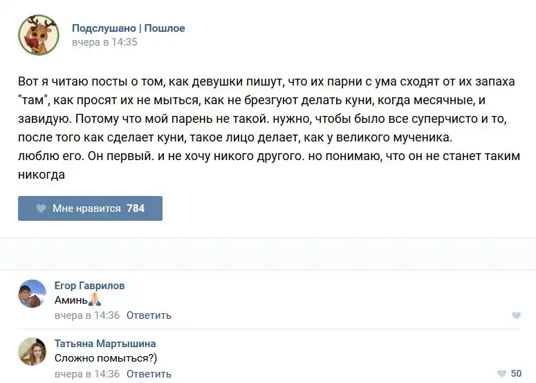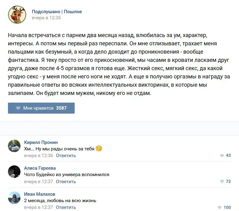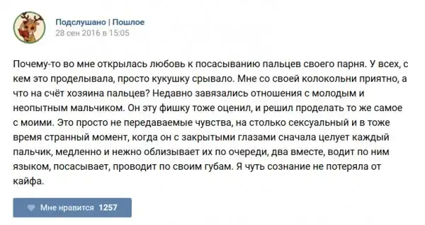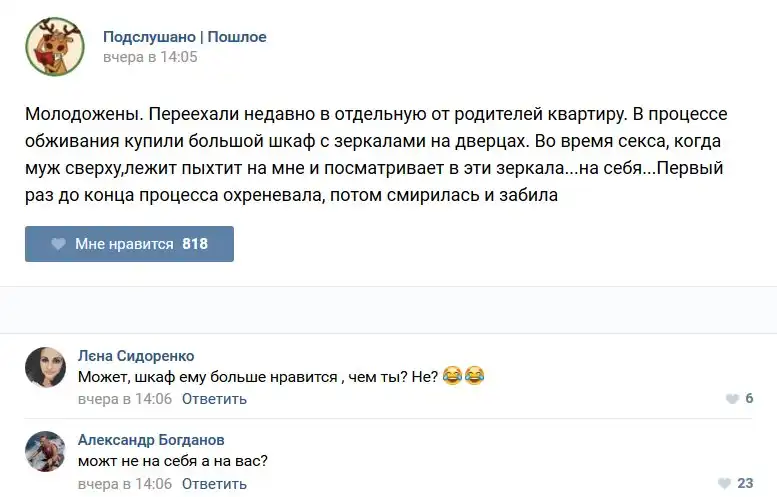 У каждого человека есть своя любимая группа или любимое сообщество в какой-либо социальной сети. Иногда это группа не совсем приличная, поэтому нет возможности в открытом режиме подписаться на неё и прочитывать свежие посты. Мы предлагаем вам очередную порцию из серии интересных постов в группе «Подслушано пошлое». Сегодняшняя запись: Подслушано пошлое предлагает посмотреть несколько интересных и запоминающихся постов, вместе с комментариями из данной группы в социальной сети ВКонтакте.