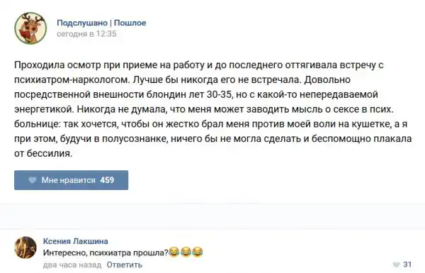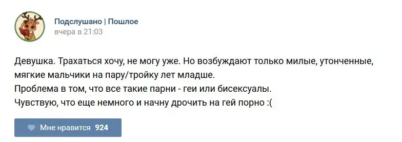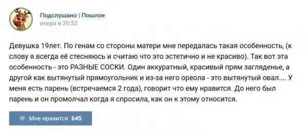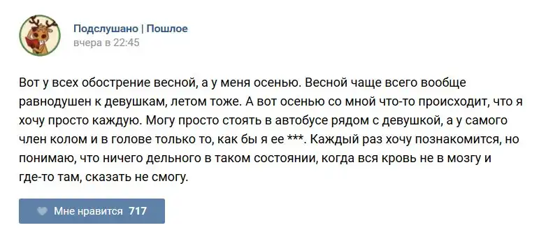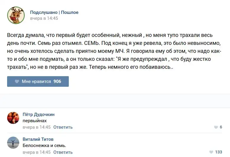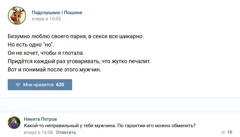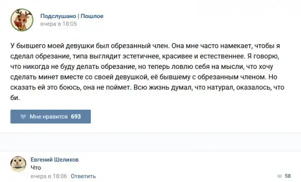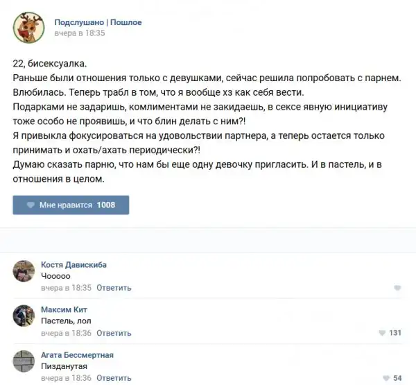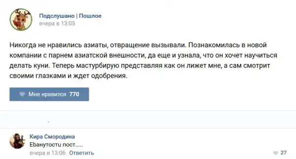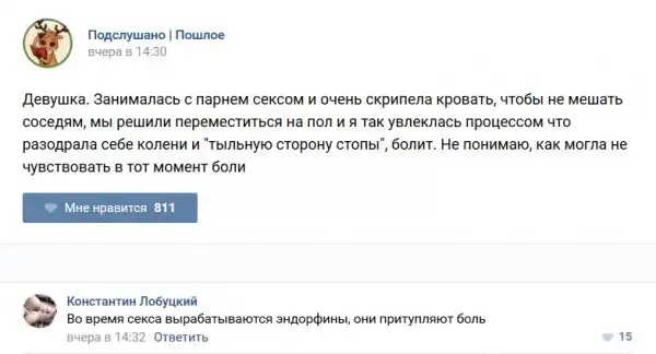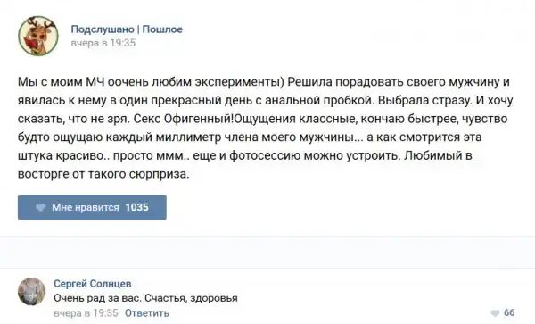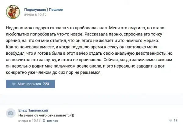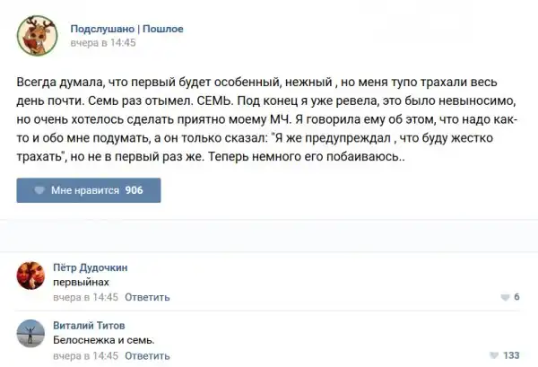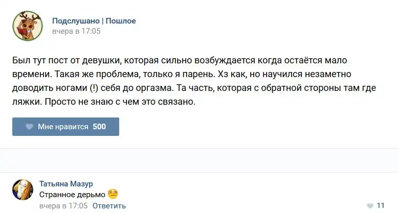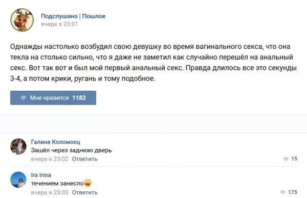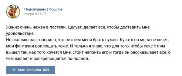 У каждого человека есть своя любимая группа или любимое сообщество в какой-либо социальной сети. Иногда это группа не совсем приличная, поэтому нет возможности в открытом режиме подписаться на неё и прочитывать свежие посты. Мы предлагаем вам очередную порцию из серии интересных постов в группе «Подслушано пошлое». Сегодняшняя запись: Подслушано пошлое предлагает посмотреть несколько интересных и запоминающихся постов, вместе с комментариями из данной группы в социальной сети ВКонтакте.