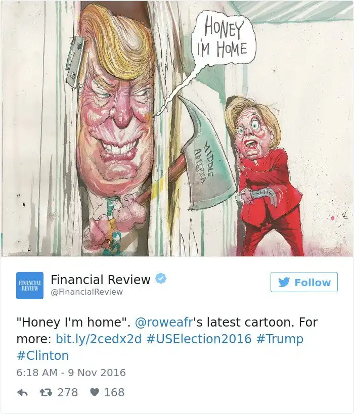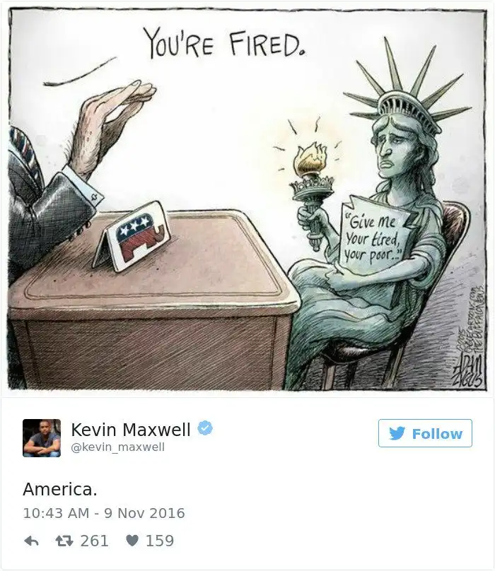 Политические карикатуристы живо отреагировали на победу Дональда Трампа на выборах президента США: их эмоции и накал выборов отражен в карикатурах. Особенно досталось партии республиканцев, верхушка которой пыталась не допустить Трампа к выборам. Много шуток над слоном (символ их партии), который в ужасе от симпатий своих избирателей. Почти все карикатуры понятны без знания языка, смотрите сами!