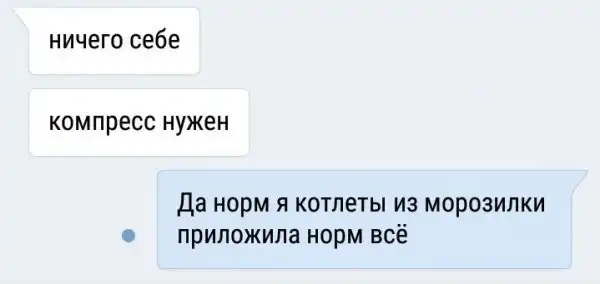 Говяжьи котлеты - от головной боли, куриные - от зубной, рыба - от фингала под глазом