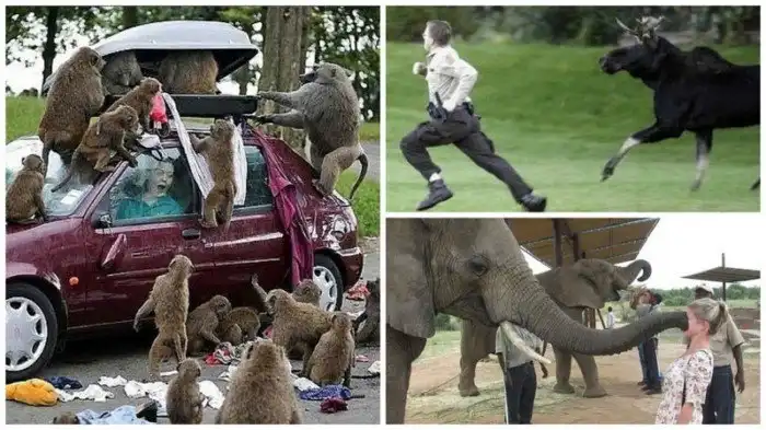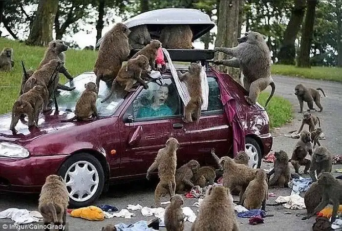 16. Боевой отряд бабуинов разграбил чемодан, пристегнутый к багажнику автомобиля, оторвал боковое зеркало и страшно перепугал женщину за рулем
