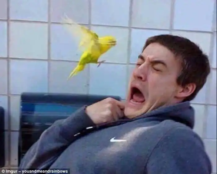 1. Маленькая, но очень гордая птичка собирается откусить этому человеку нос