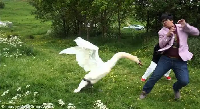6. Лебеди, как известно, склонны к внезапной агрессии - и этот мужчина усвоил урок