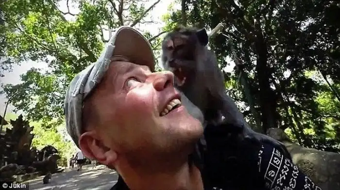 13. Кажется, этот безбашенный турист даже рад тому, что на его плечо залезла бешеная обезьяна
