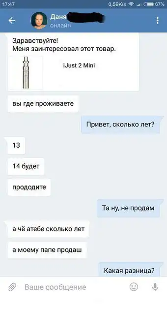 Далее вас ждет довольно забавная переписка школьника, решившего податься в вейперы и пытавшегося купить себе электронную сигарету. Давайте посмотрим, что из этого вышло.