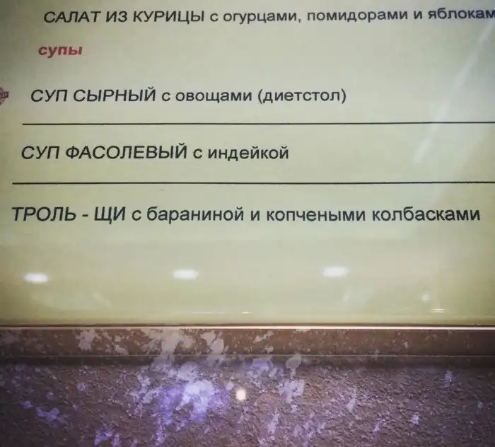 Заказал троль-щи. Принесли суп-лапшу с ломтиком сосиски. Троллинг удался.