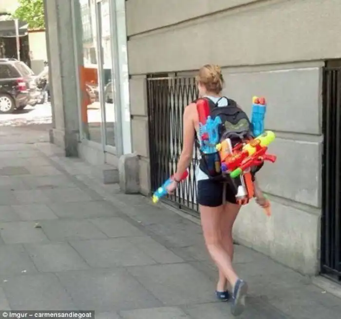По снаряжению этой дамы сразу видно - к лету и боям на водяных пистолетах готова